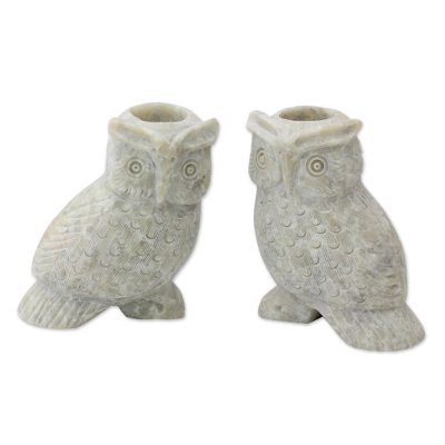 Night Glow,'Hand Carved Soapstone Owl Candle Holders (Pair)'