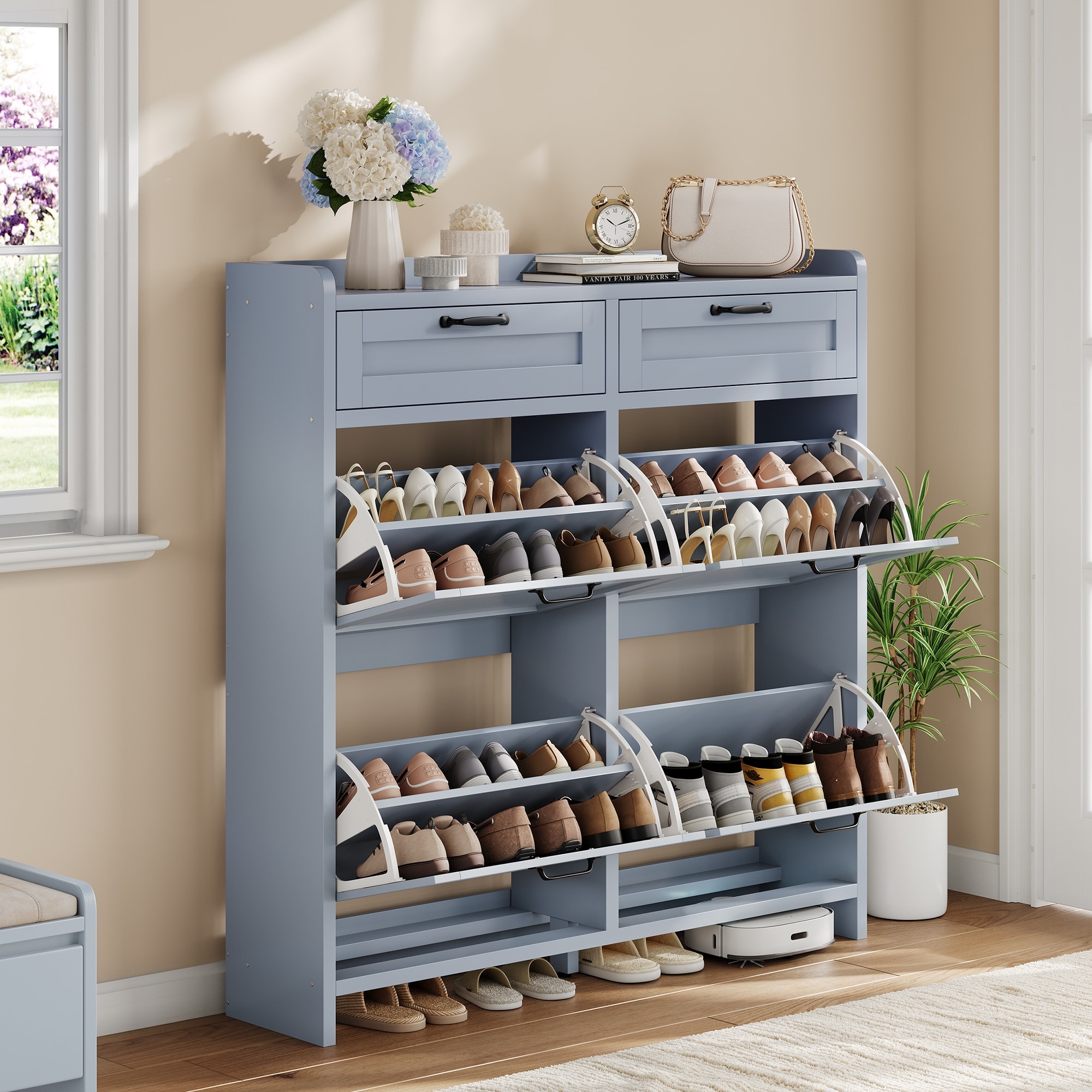 Shoe Cabinet with 4 Flip Drawers & 2 Top Drawers, Wooden Shoe Organizer Cabinet with Adjustable Shelf