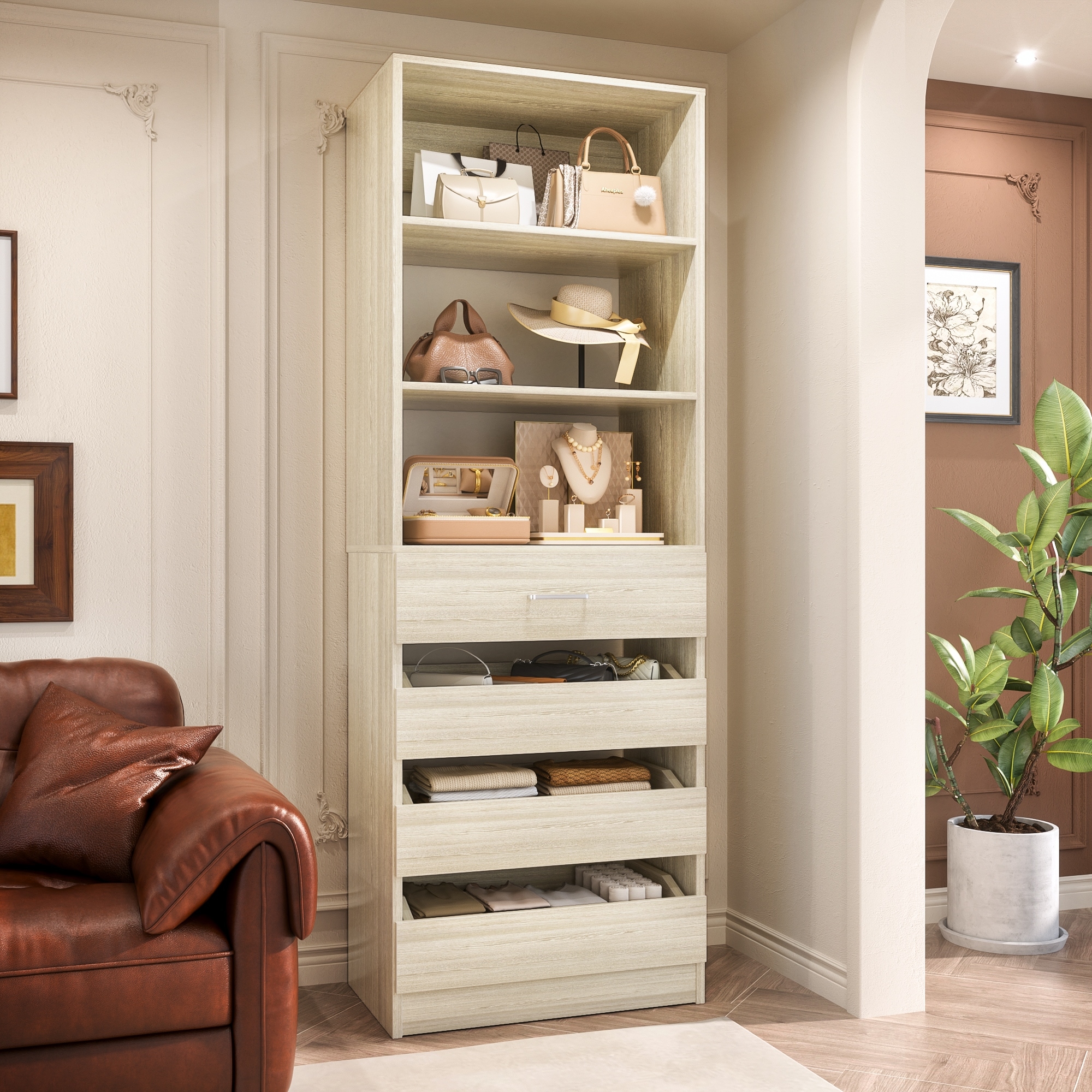 Freestanding Closet System with 4 Drawers & 4 Shelves,Wooden Closet Organizer Wardrobe Cabinet for Walk-in/Reach-in Closet