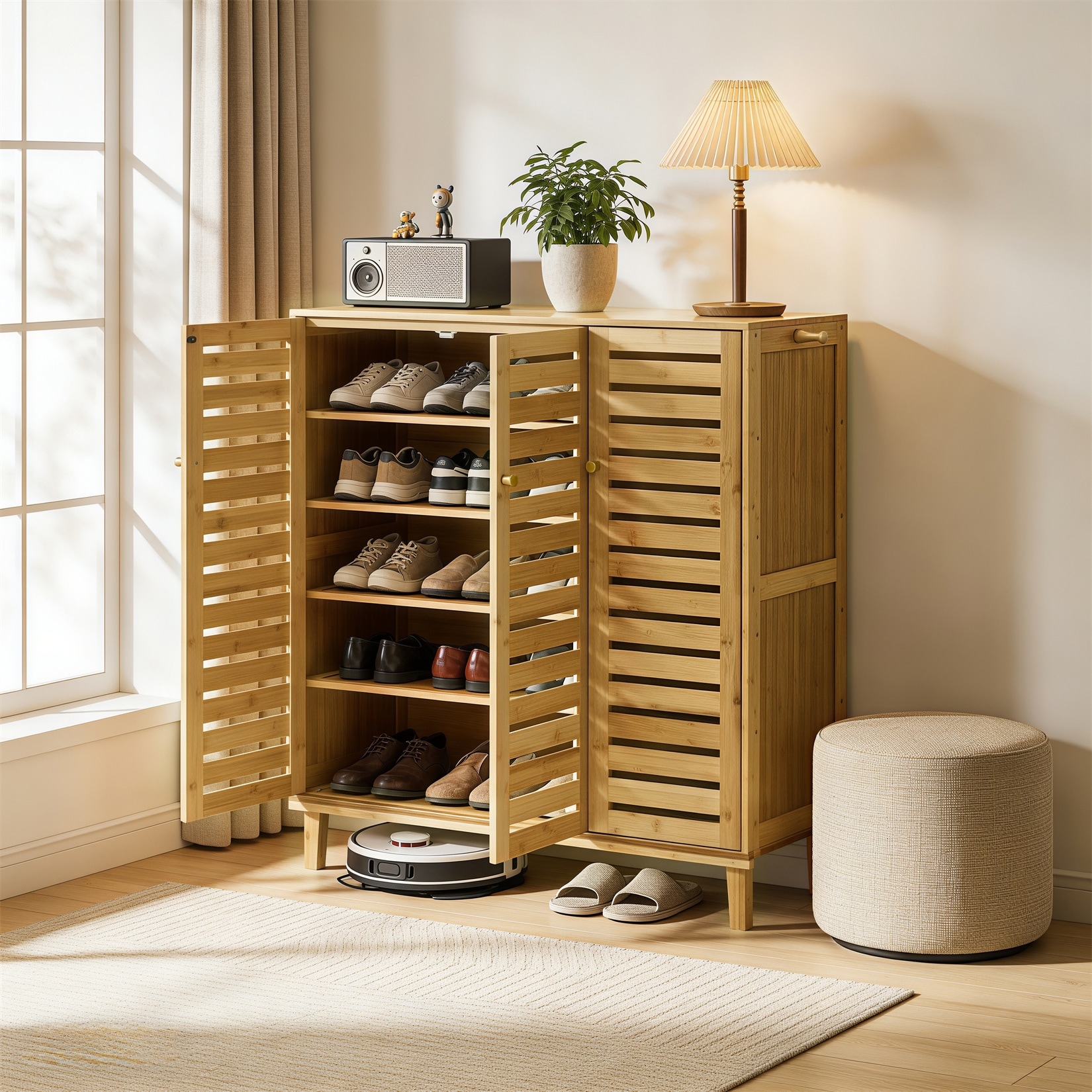 Freestanding Bamboo Shoes Rack Organizer Cabinet with Doors and Shelves