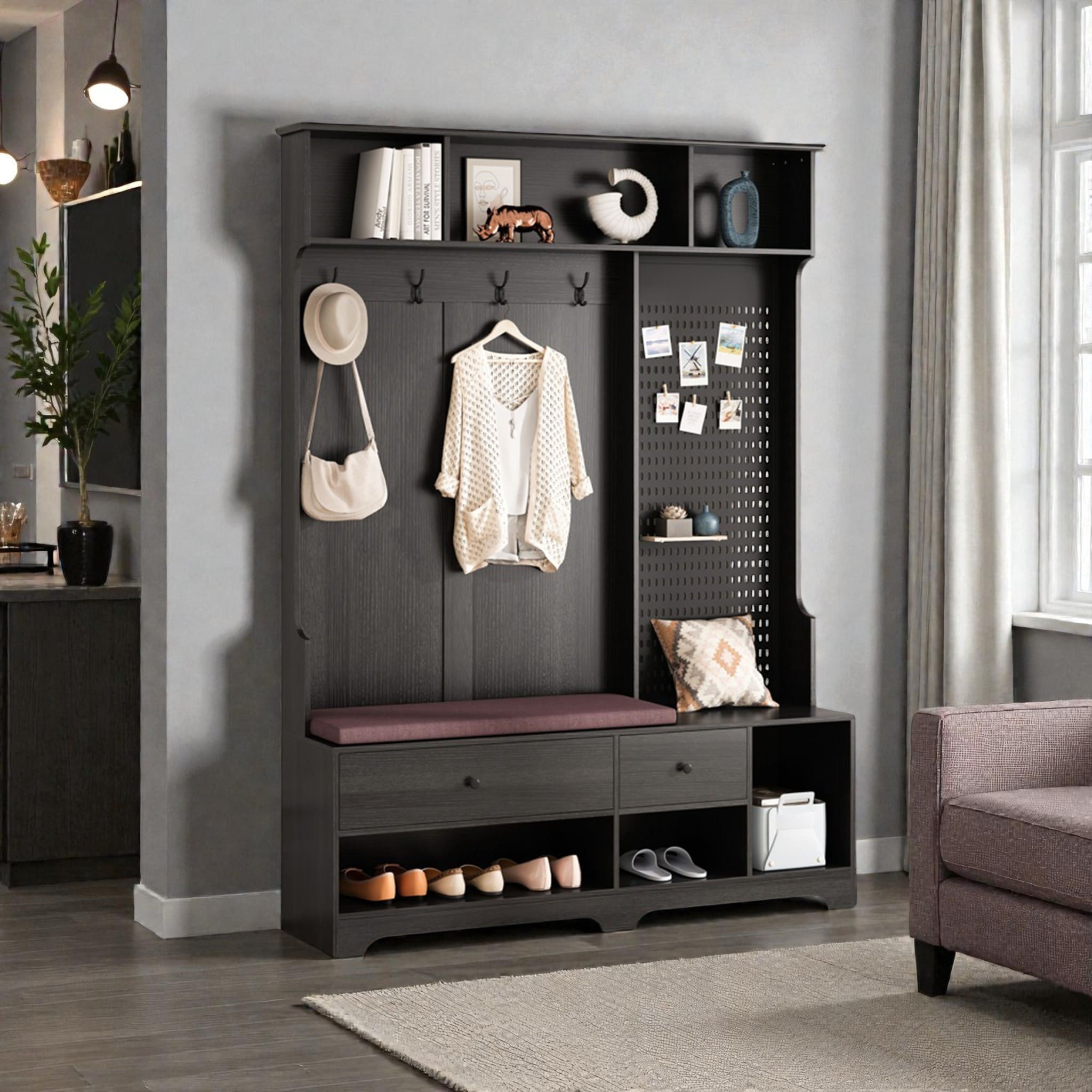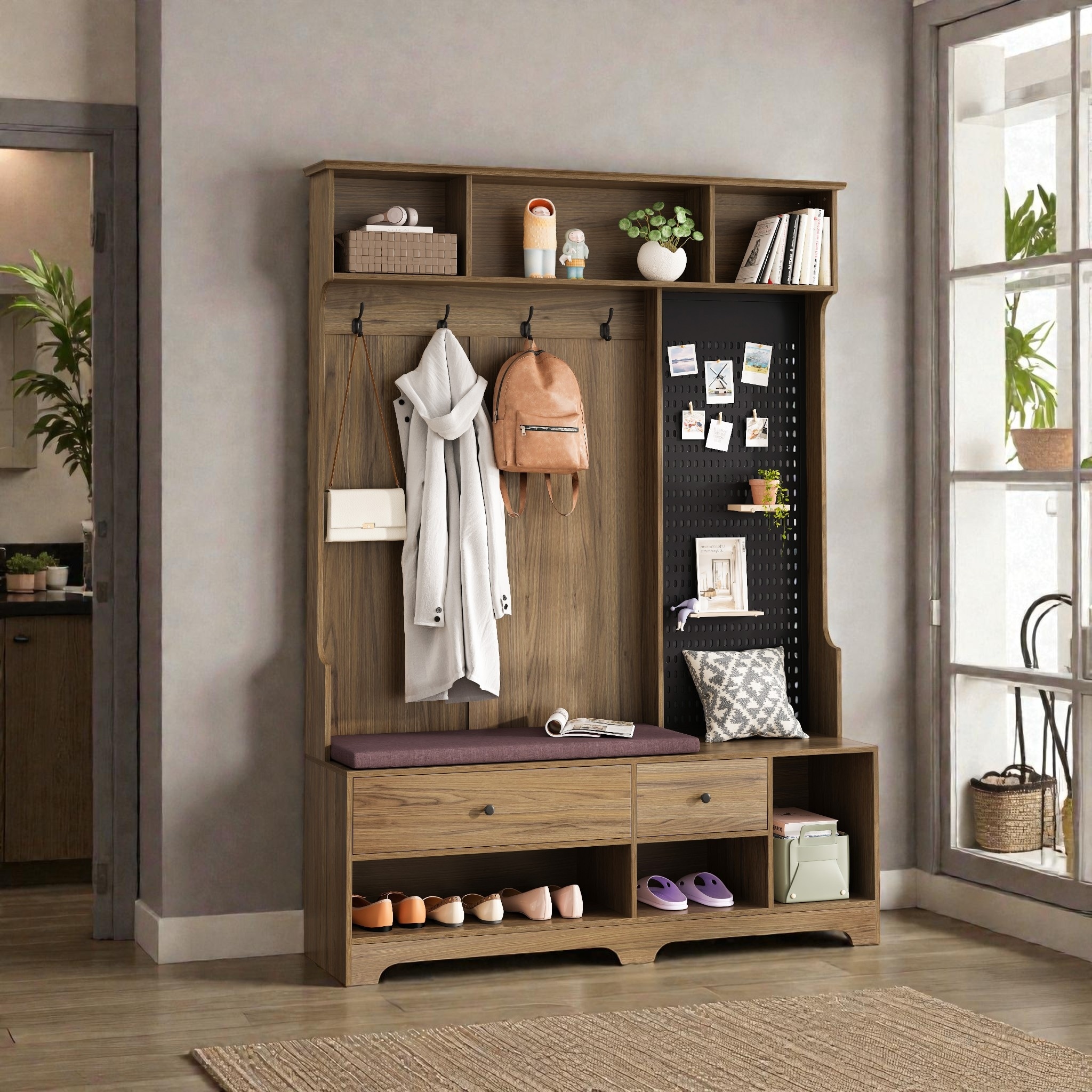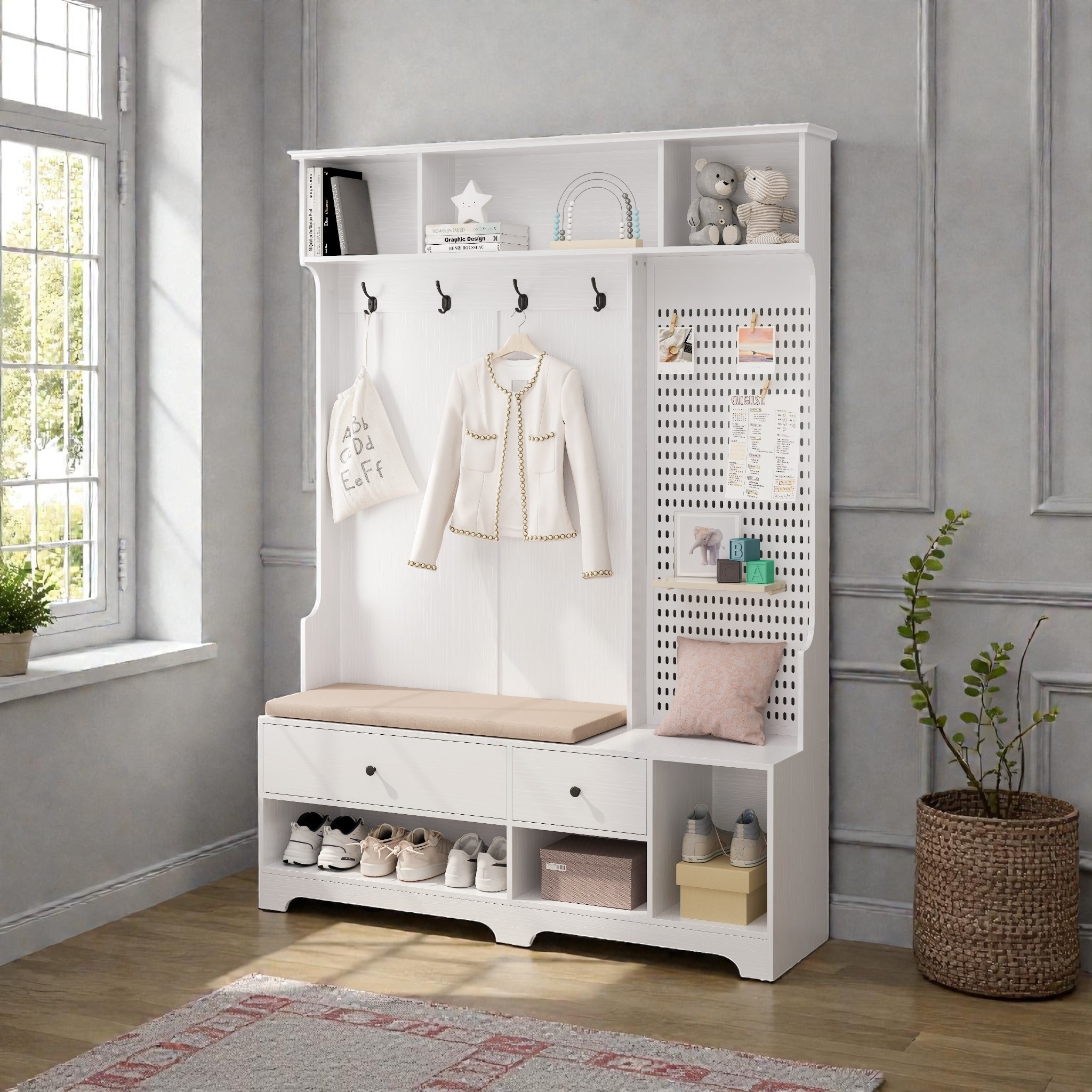 Hall Tree with Bench and Coat Rack, Entryway Storage Cabinet with Removable Linen Cushion, Pegboard, Hooks, Shelves and Drawers