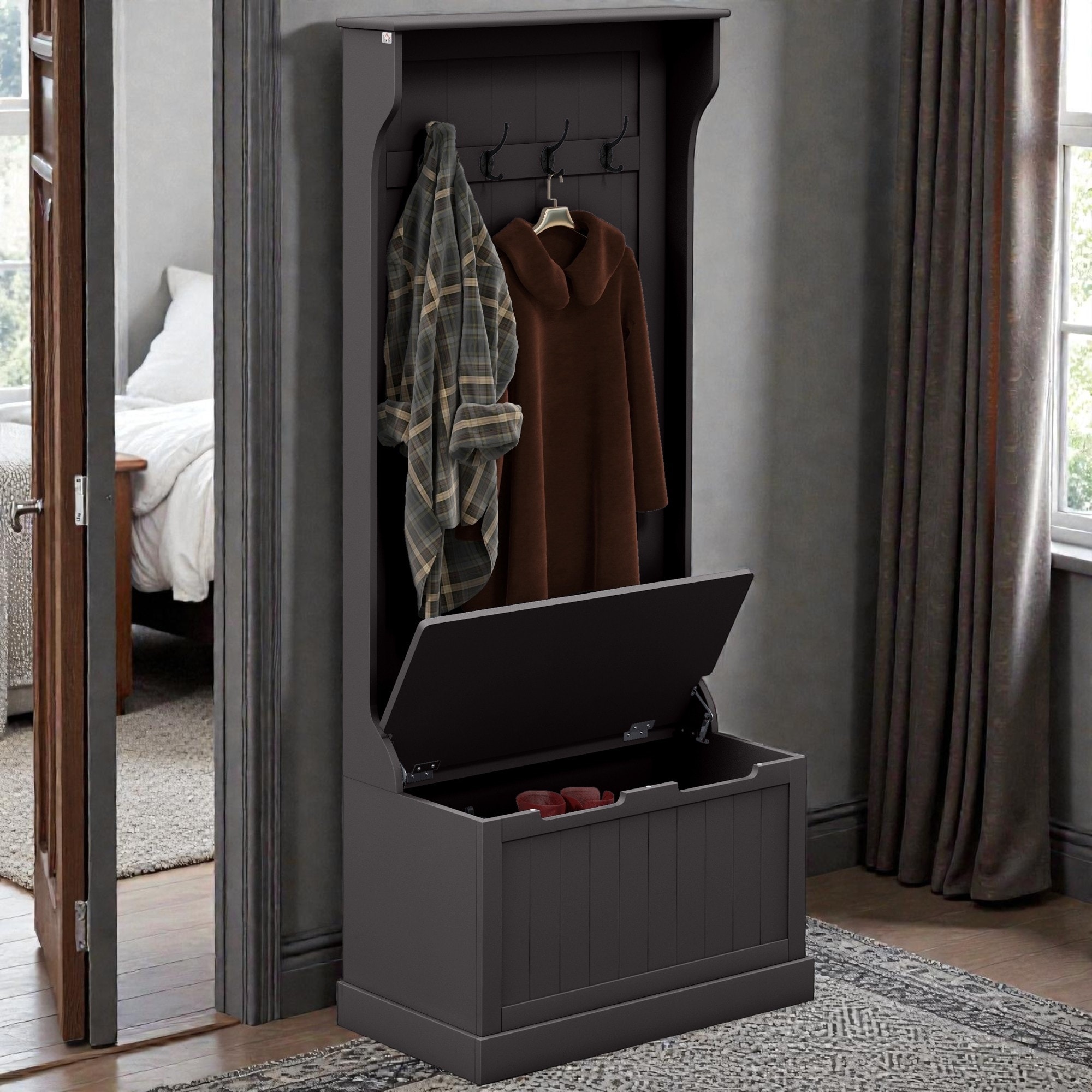Hall Tree Entryway Bench with Shoe Storage, 4 Double Hooks, Seat, and Anti-Tip Kit for Mudroom, Foyer, or Hallway - MDF
