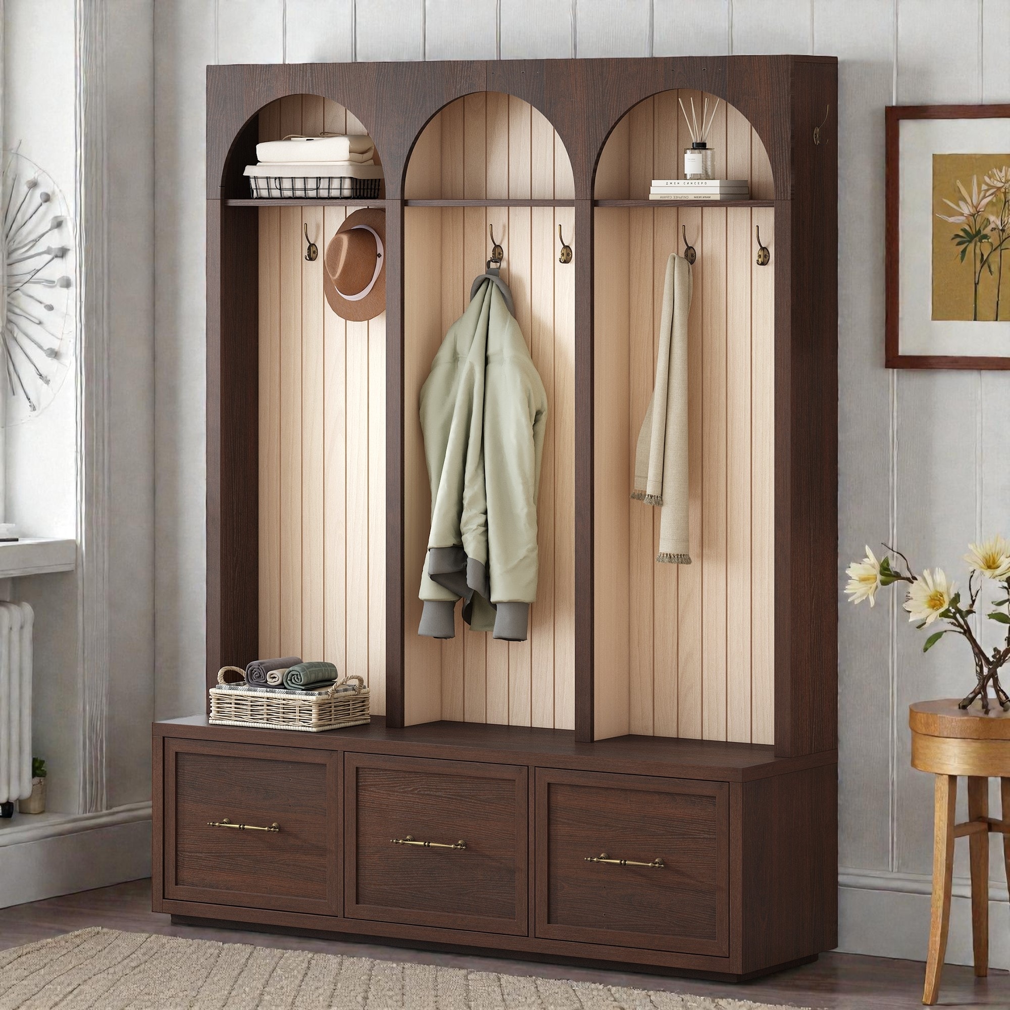 Farmhouse Hall Tree with Bench, 8 Hooks, 3 Storage Drawers, Arched Back, Entryway Coat Rack and Shoe Organizer for Mudroom - MDF