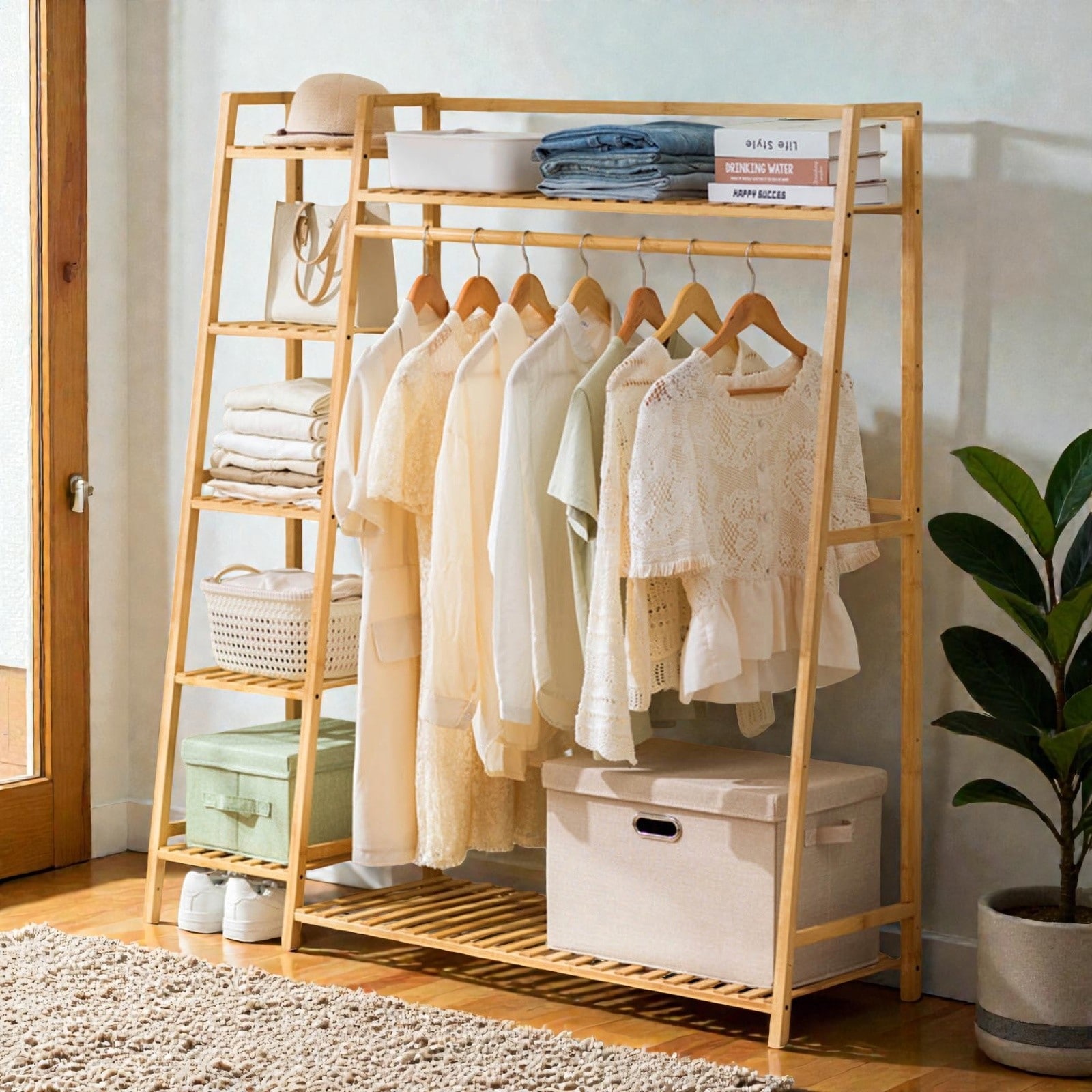 Bamboo Garment Rack with Multi-Tier Shelves and Shoe Storage, Free Standing Clothes Organizer for Entryway or Bedroom