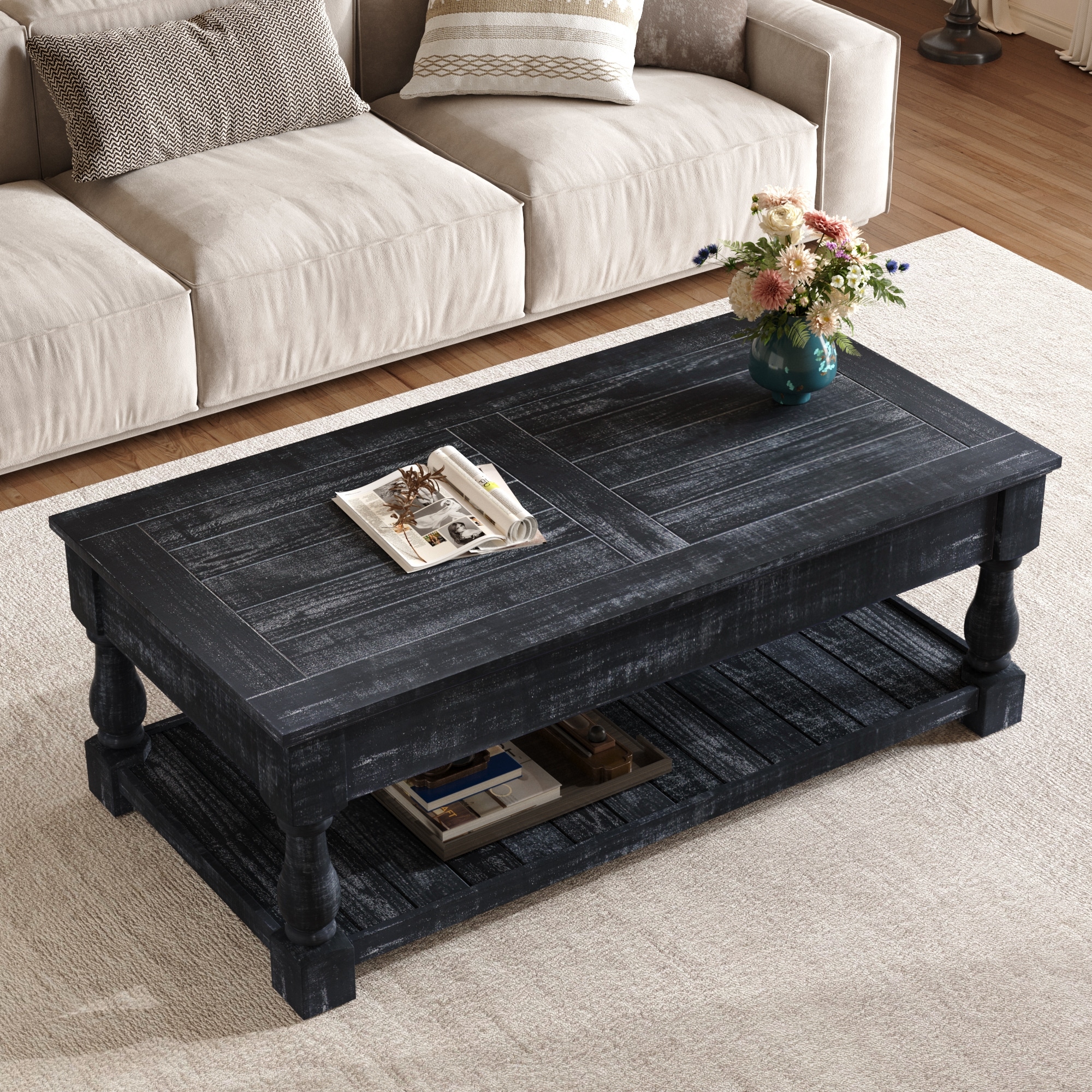2-Tier Living Room Table Farmhouse Lift-Top Coffee Table with Hidden Storage, Rectangular Storage Center Table with Open Shelves