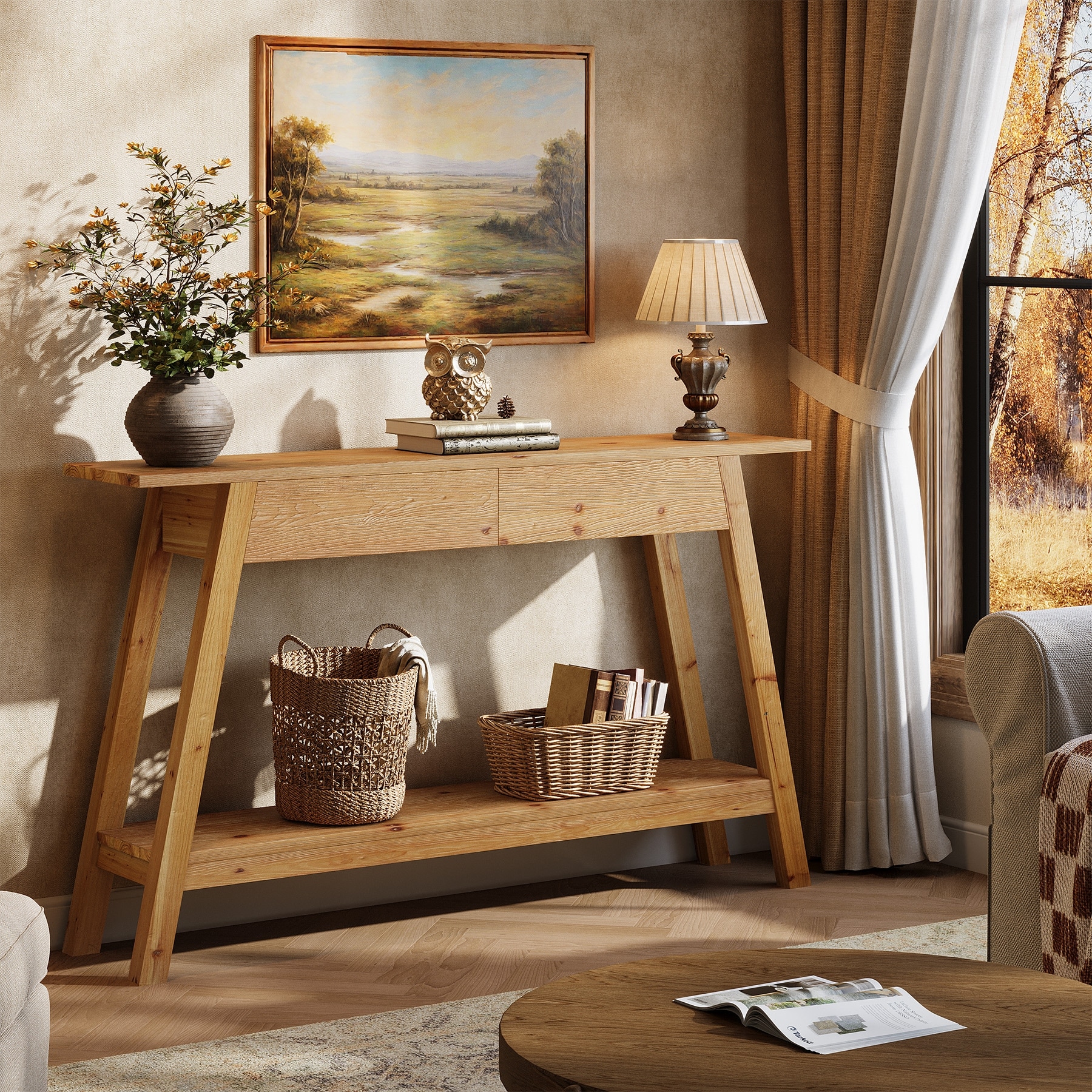 2-Tier Solid Wood Entryway Table with 2 Drawers