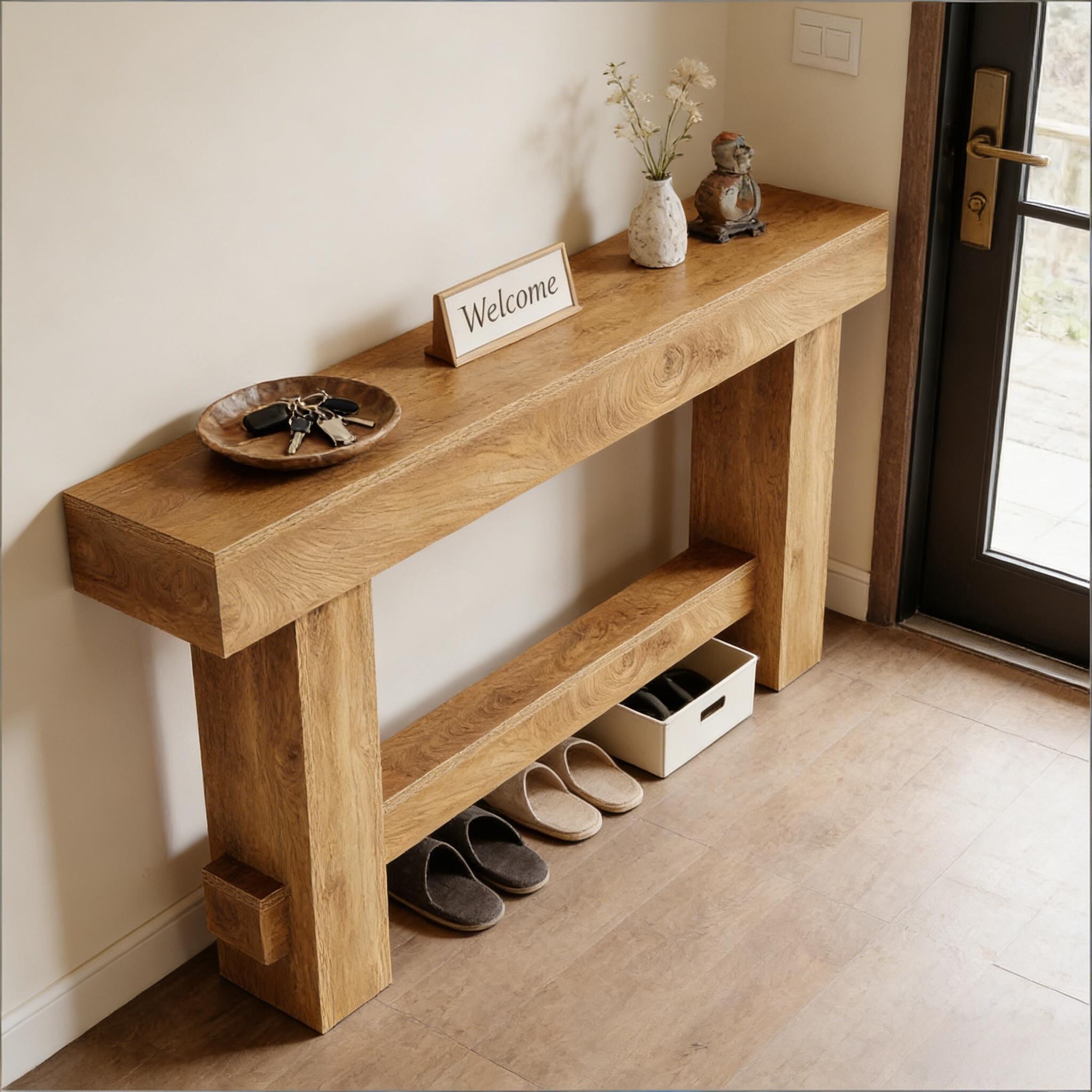 Rustic Wooden Console Table With Storage Drawers And Open Shelf For Hallway And Living Room