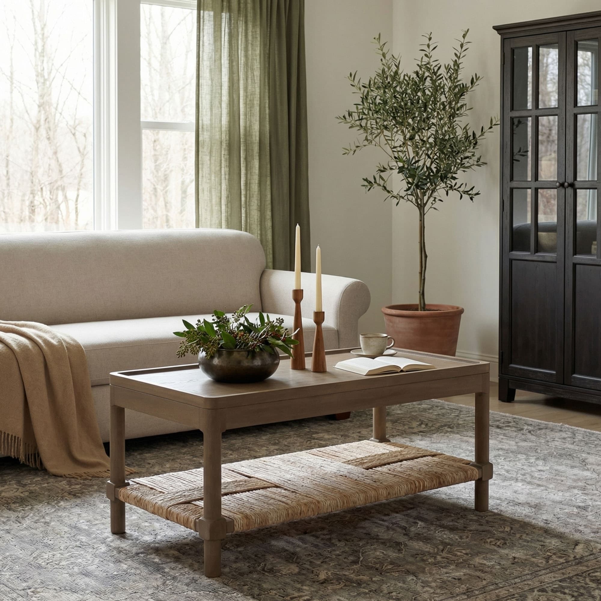Asher Wood Tray Top Coffee Table with Rush Shelf by East at Main