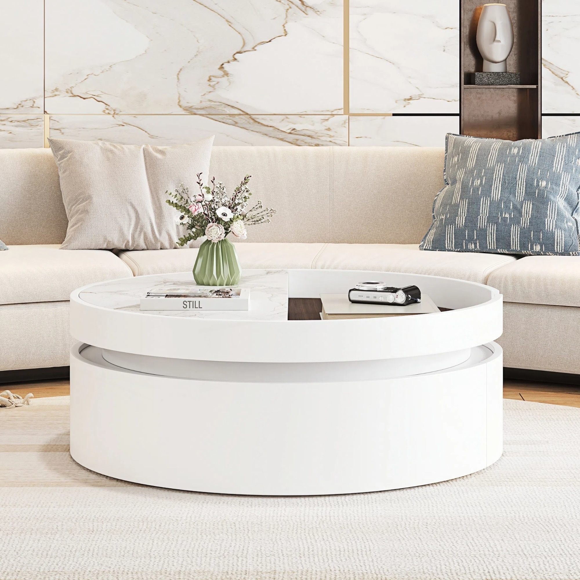 White Round Lift Coffee Table with 1 Drawer