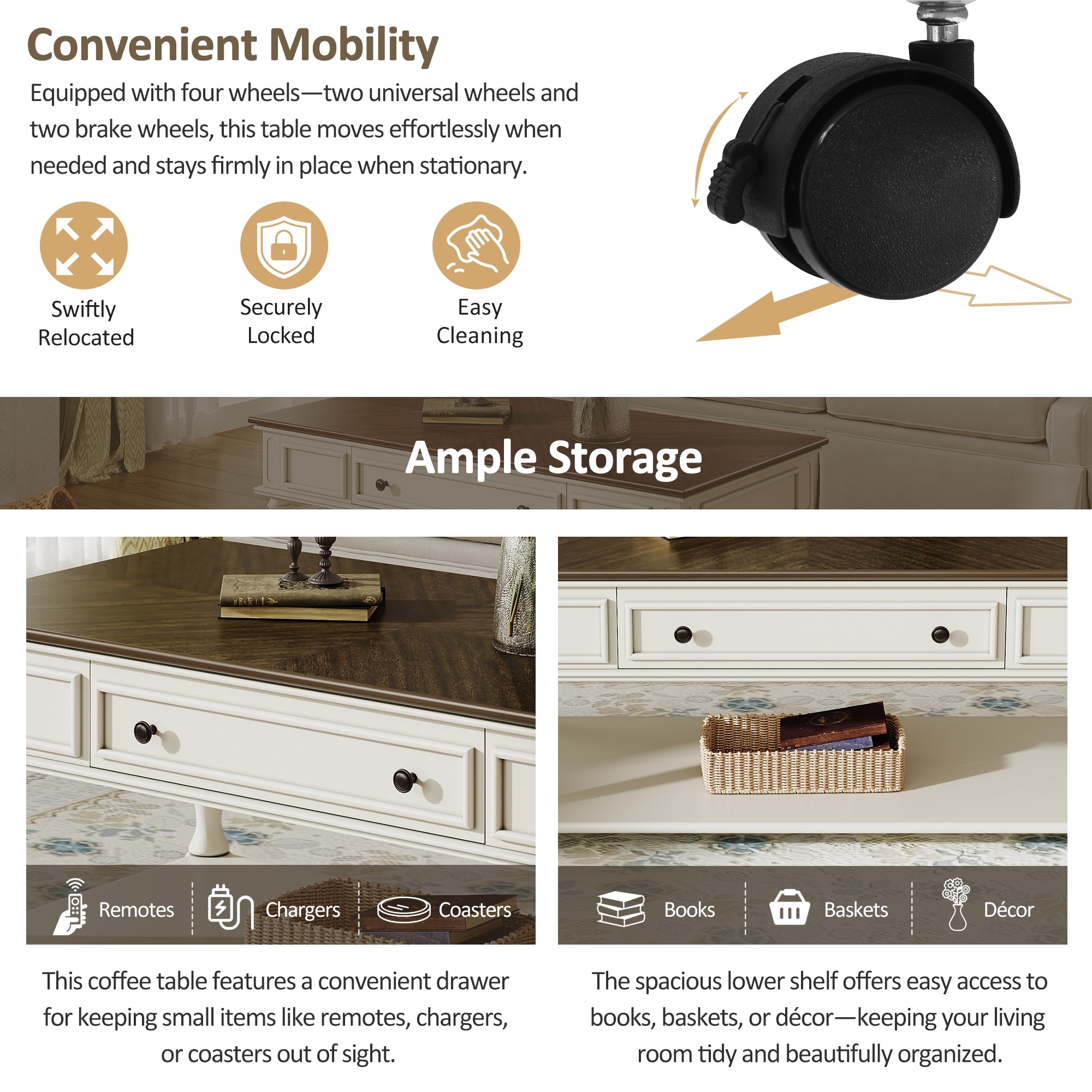 Coffee Table with Drawer with Lockable Wheels Solid Wood Legs