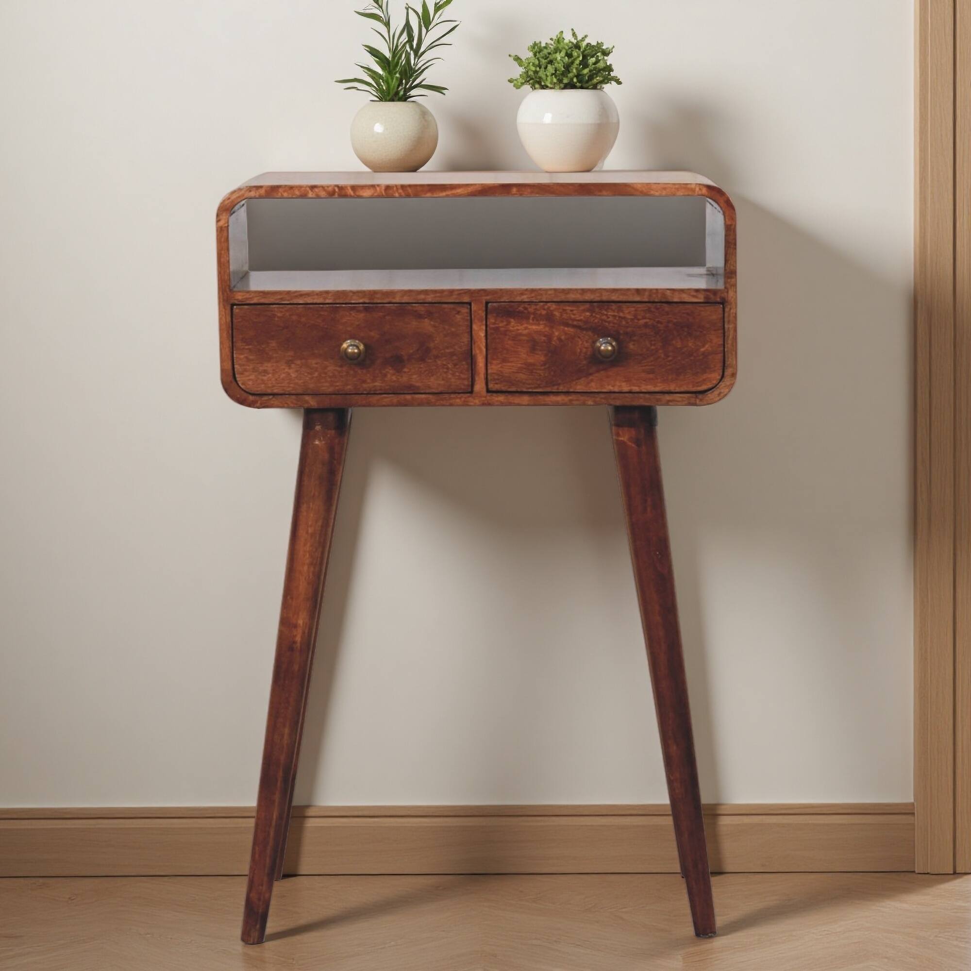 23.6" Solid Mango Wood Mini Console Table with 2 Drawers & Open Slot