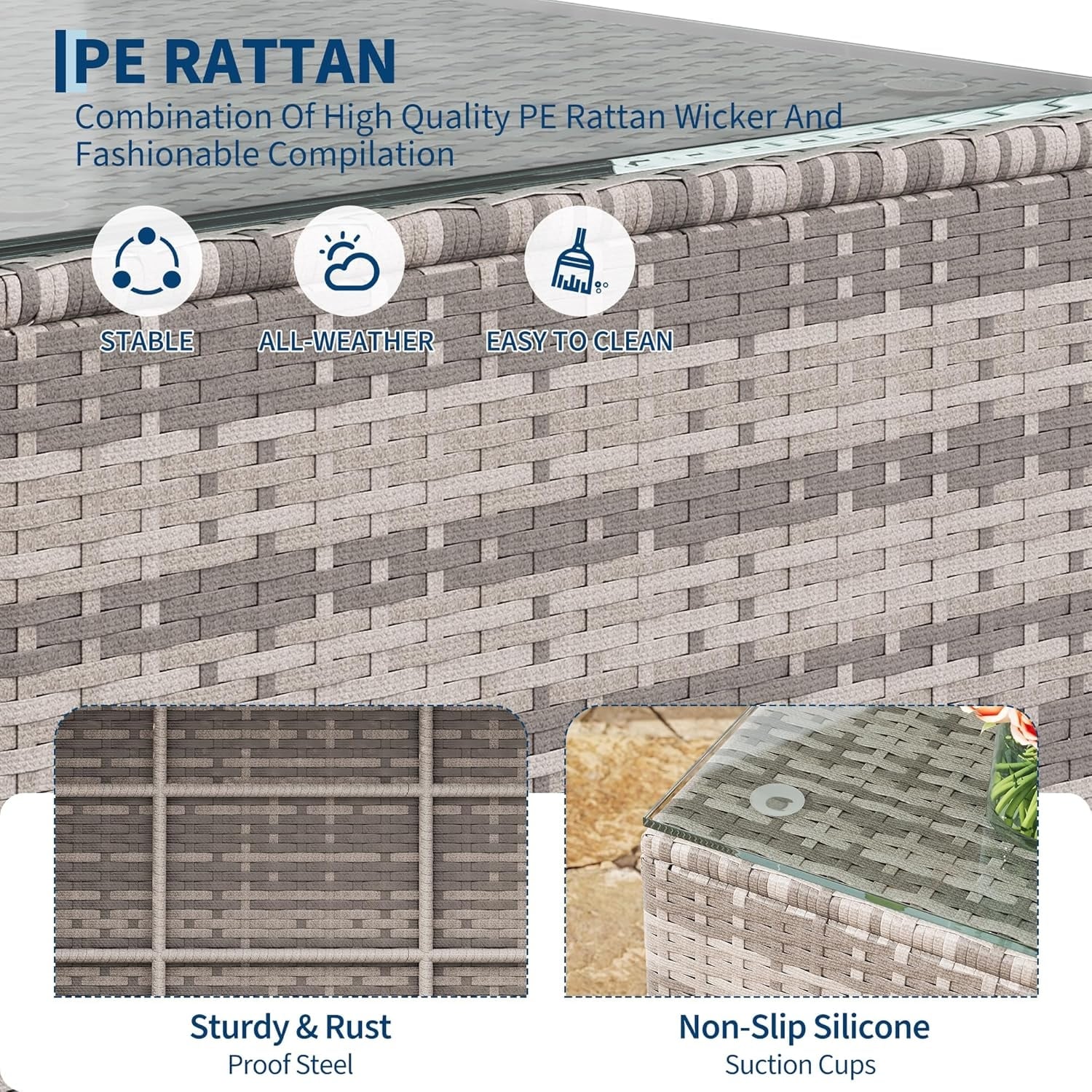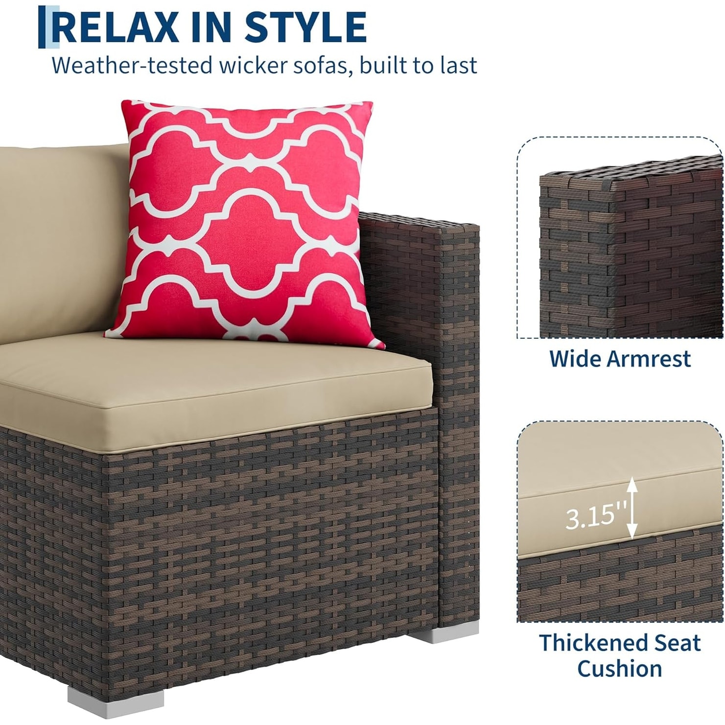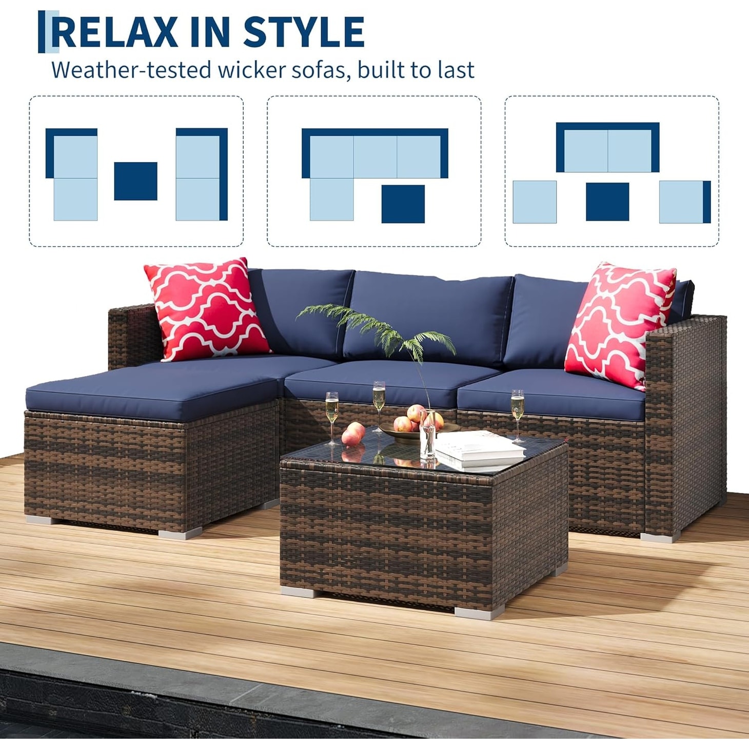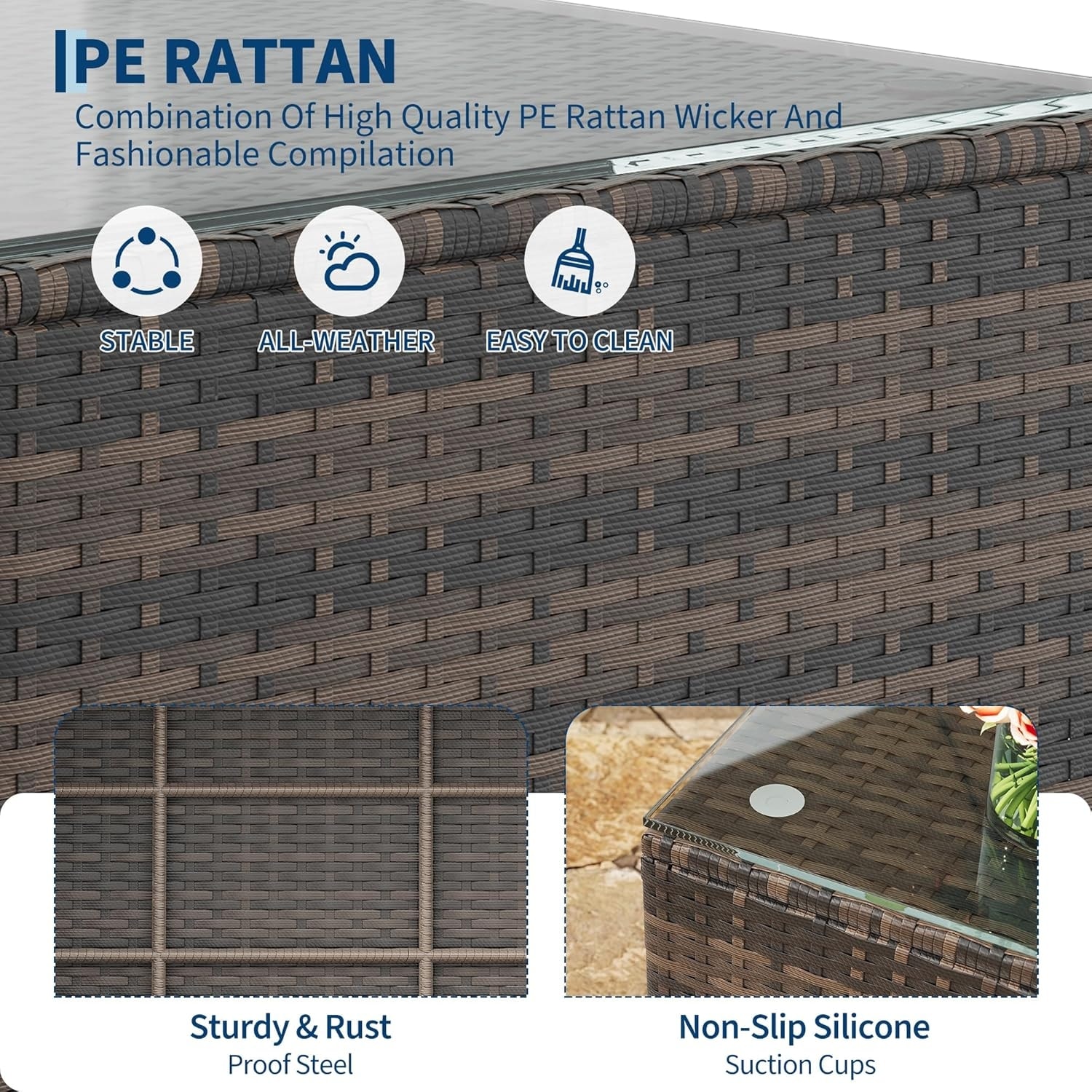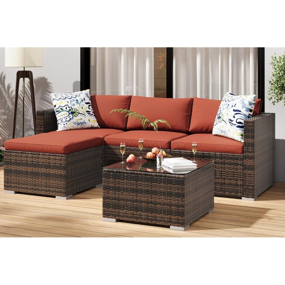 5-Piece Patio Furniture Set, Wicker Sectional Sofa with Ottoman & Glass Table Brown