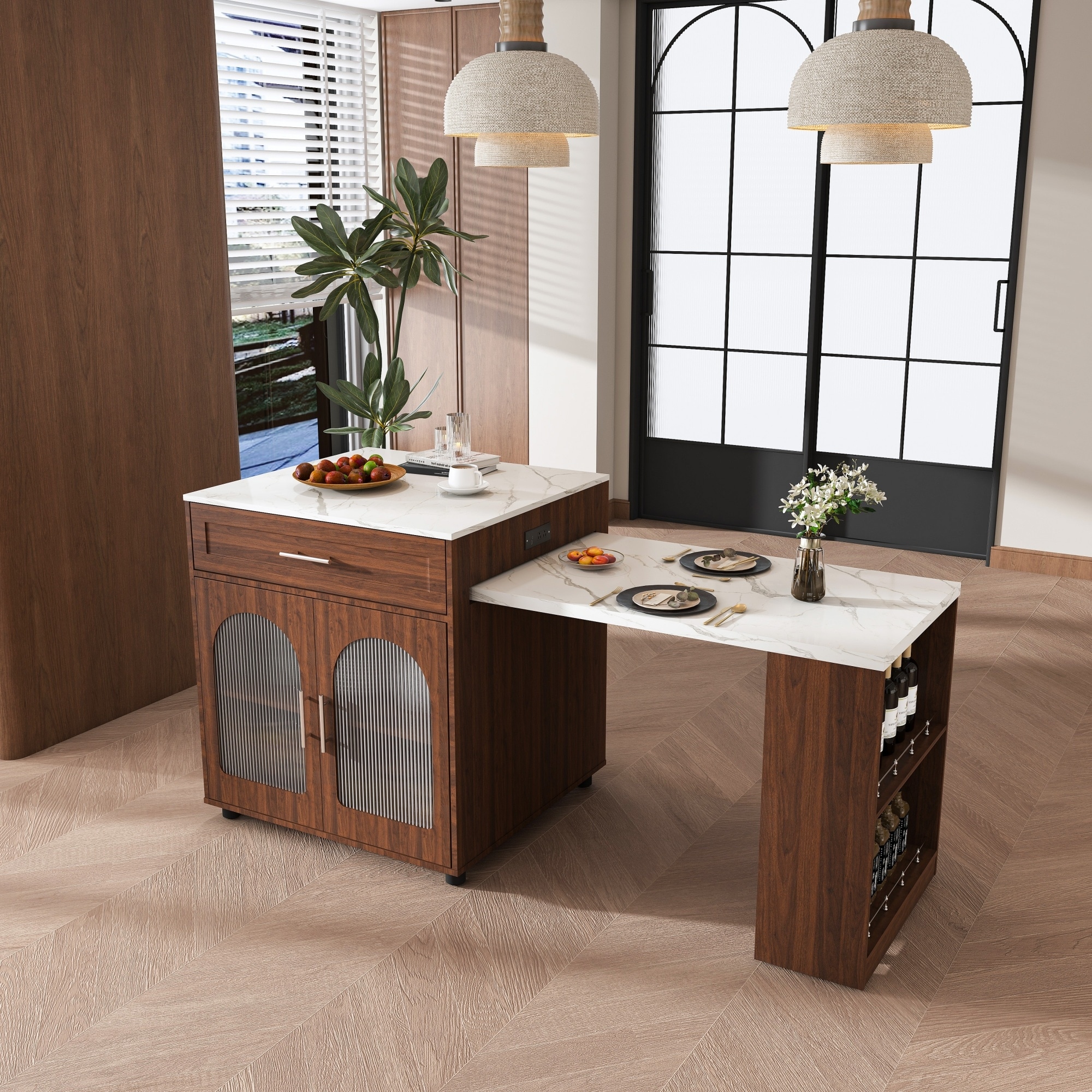 Kitchen Island with 80" Expandable Table & Casters, Walnut Multi-Functional Rolling Kitchen Cart with Dining Table