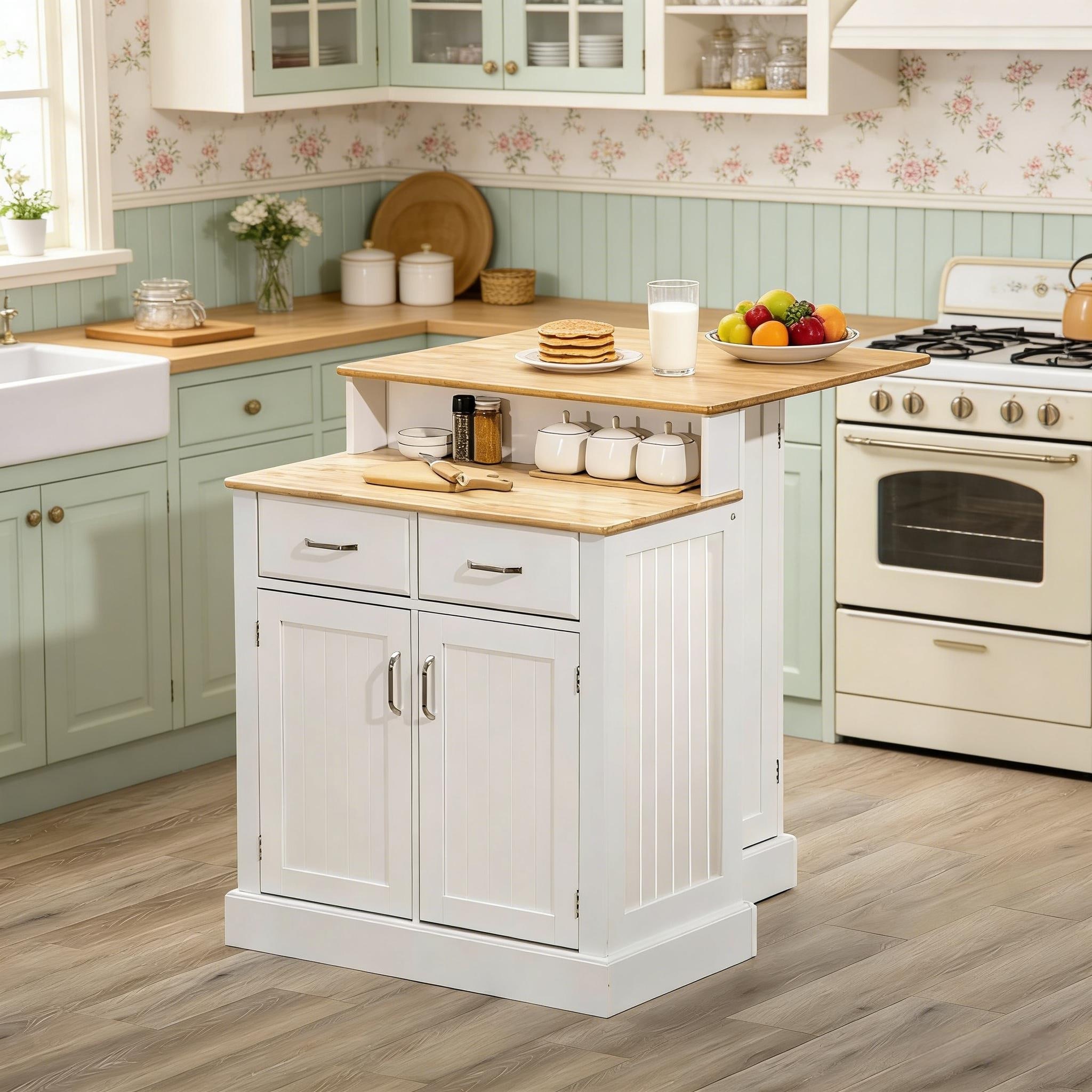Kitchen Island with Extendable Dining Table, Rubber Wood Veneer Kitchen Table with Internal Storage Rack