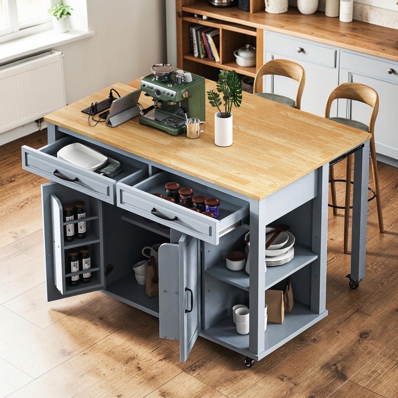 Fluted 55.5" Kitchen Island with Drop Leaf, Rolling Island Table with Drawers, Power Outlet for Functional Kitchen Organization