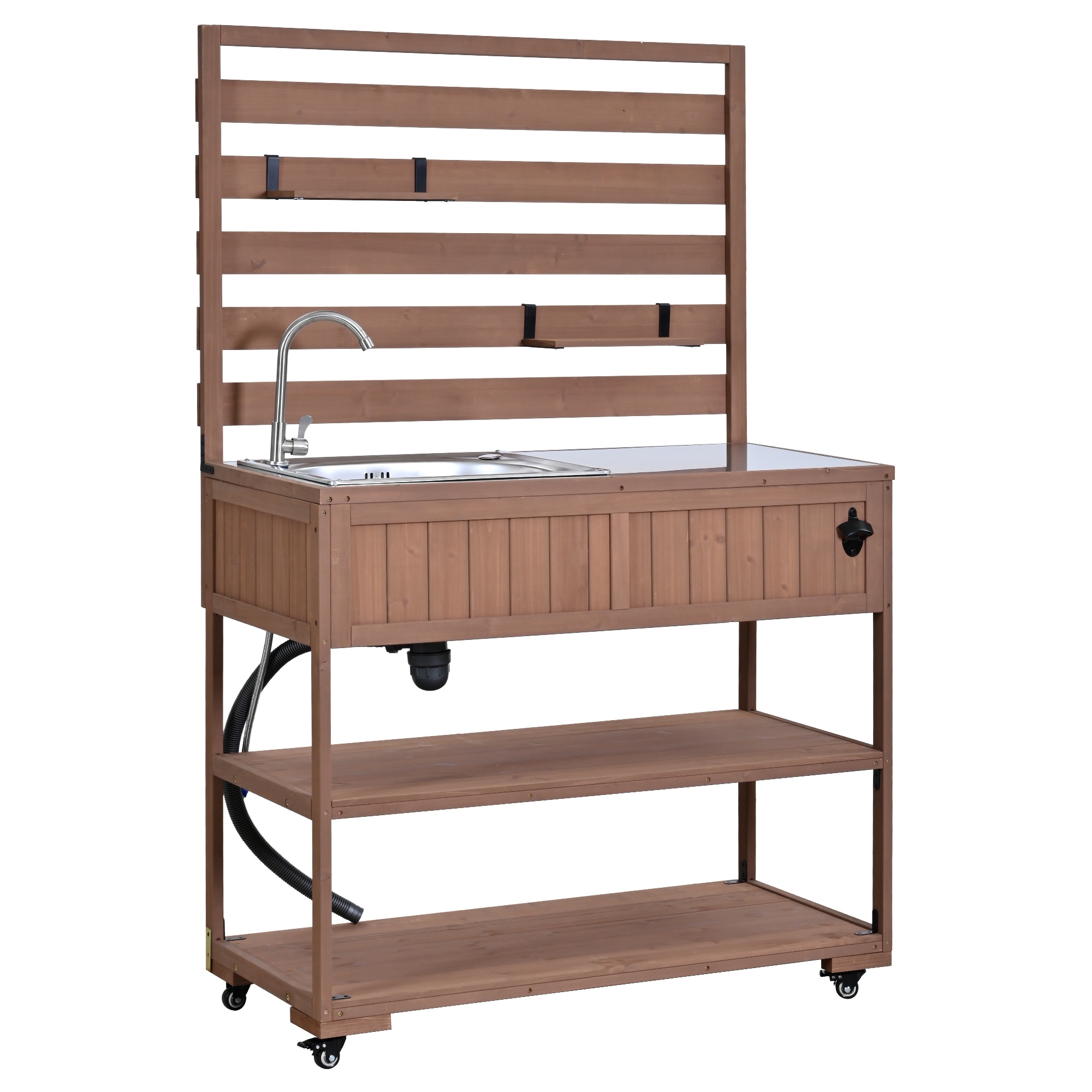 41.7'' Rolling Outdoor Kitchen Island, Solid Wood Kitchen Cart with Sink and Stainless Table Top