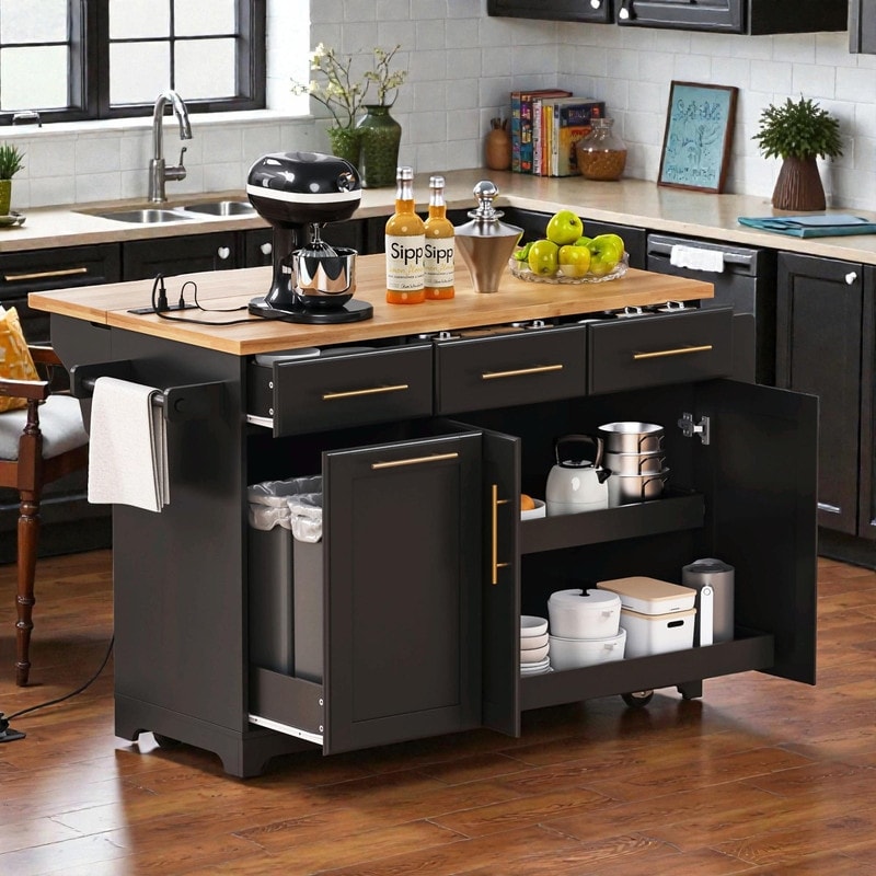 59.3" Rolling Kitchen Island with Rubber Wood Drop Leaf, Power Outlet, Pull-Out Cabinet Organizers, Trash Can Storage