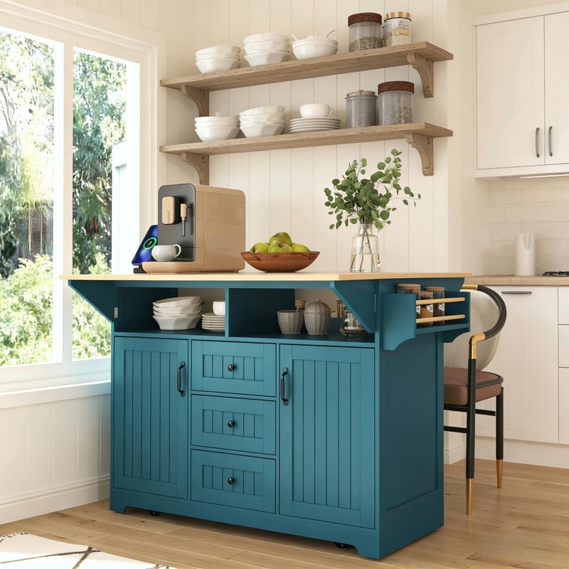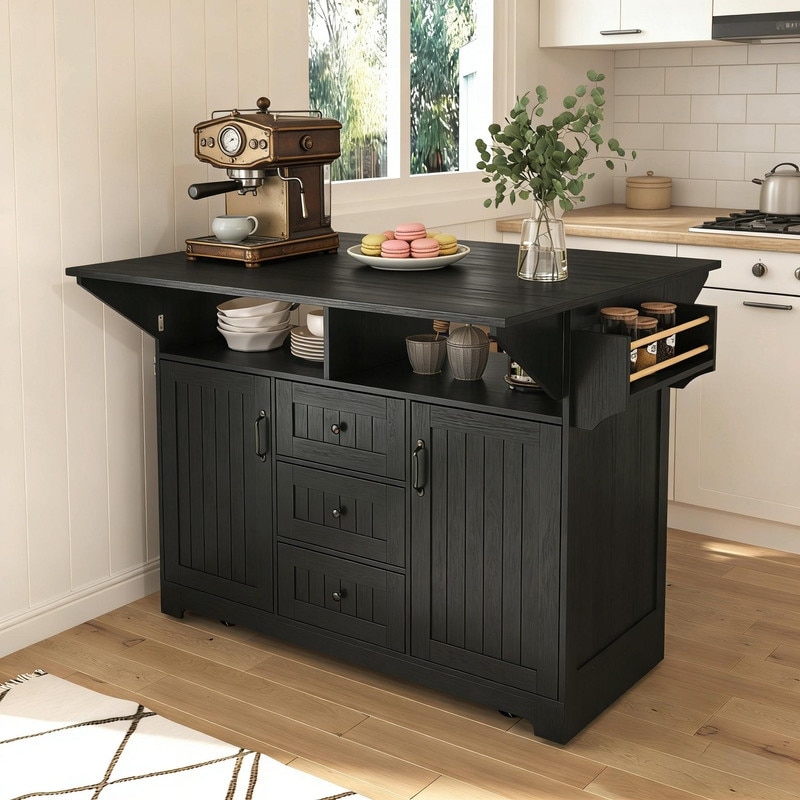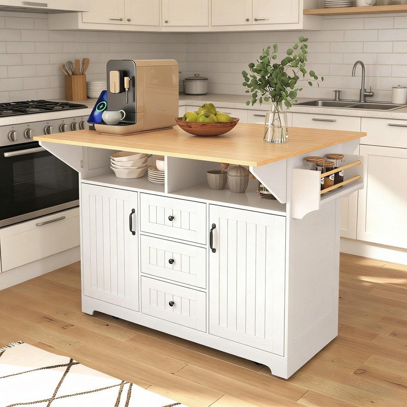 52" Fluted Kitchen Island with Drop Leaf, Power Outlet