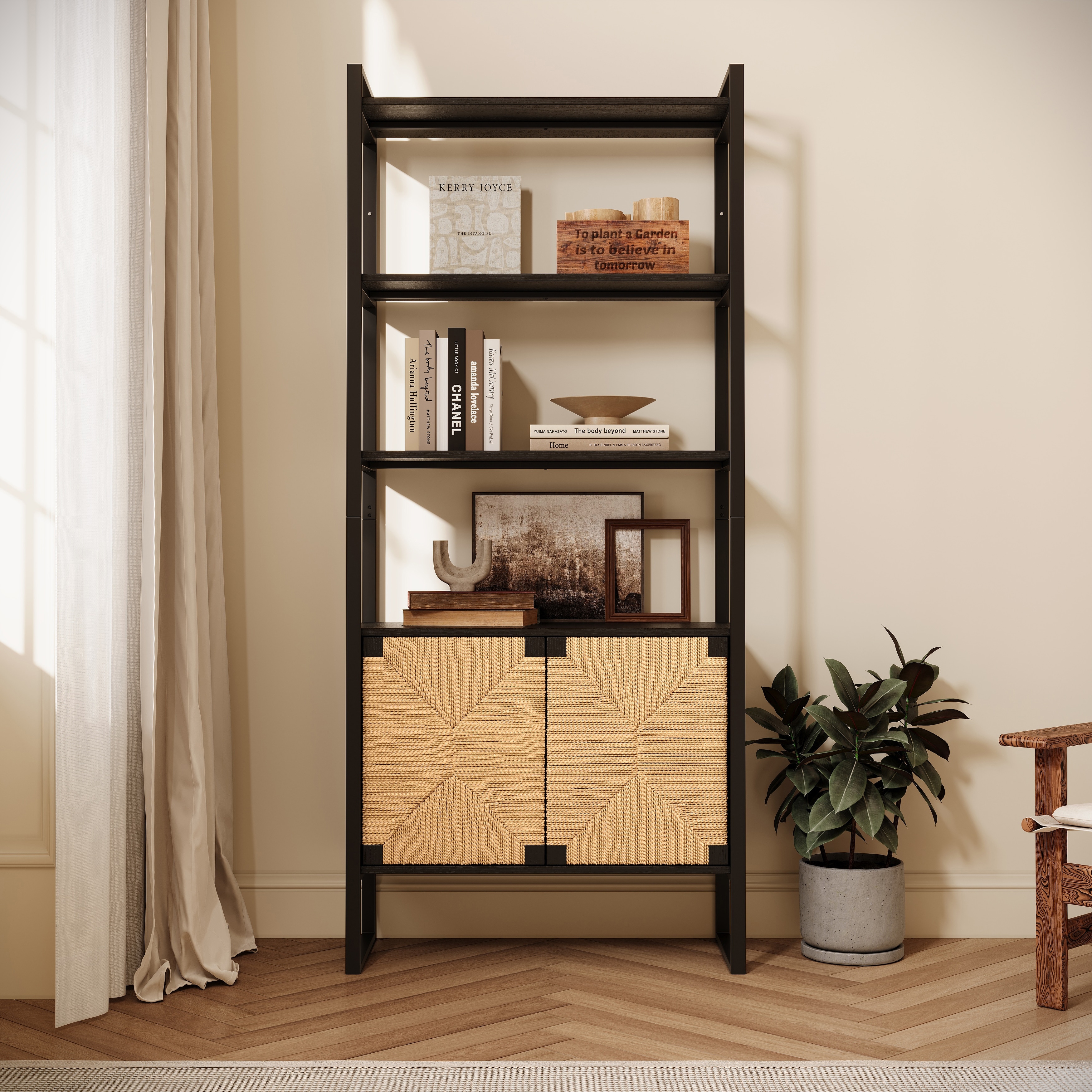 Rattan Cabinet Door Storage Bookshelf Dual Function Open Display Shelf With Cabinet