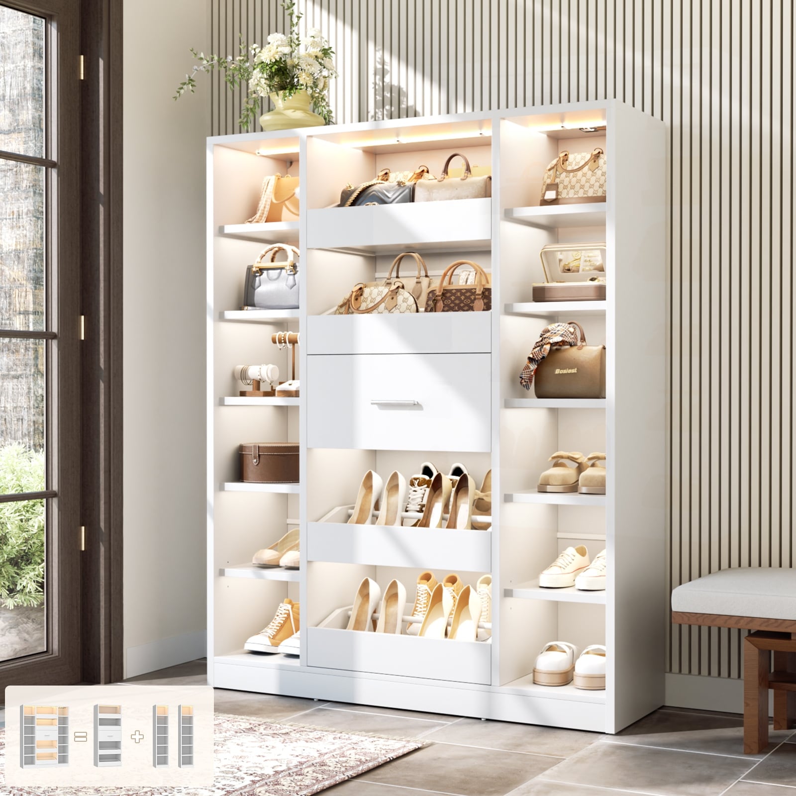 40" W Versatile Closet System with LED Lights, Wooden Walk-in Closet Organizer Wardrobe Cabinet with 5 Drawers & 12 Shelvess