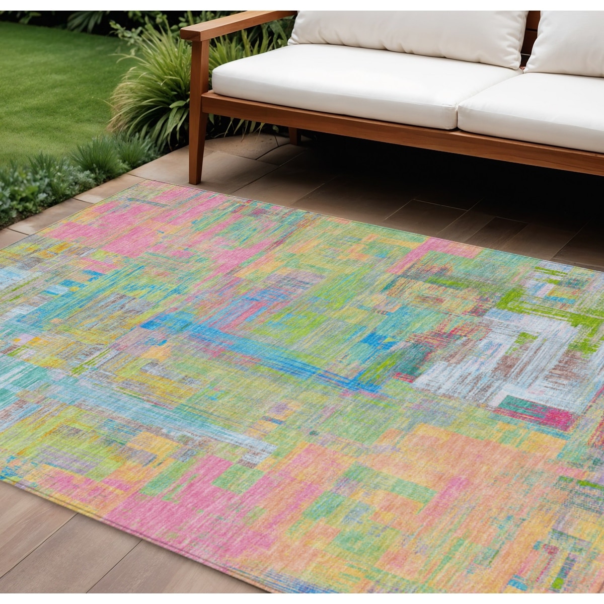 9' X 12' Pink Key Lime And Sky Blue Abstract Washable Indoor Outdoor Area Rug - 9' x 12'