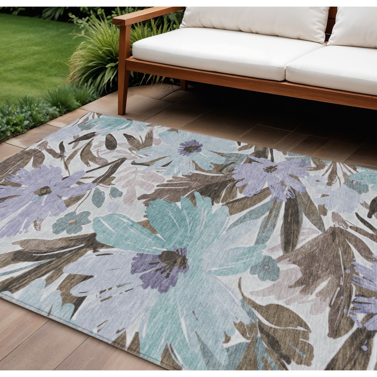 9' X 12' Teal Blue And Aqua Floral Washable Indoor Outdoor Area Rug - 9' x 12'