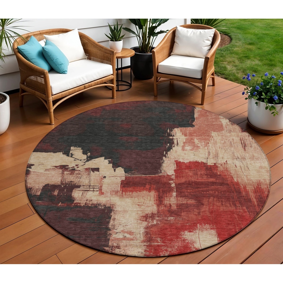 8' Brick Red And Red Round Abstract Washable Indoor Outdoor Area Rug - 6' x 9'