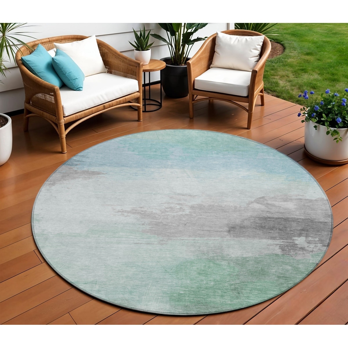 8' Blue And Mint Green Round Abstract Washable Indoor Outdoor Area Rug - 6' x 9'
