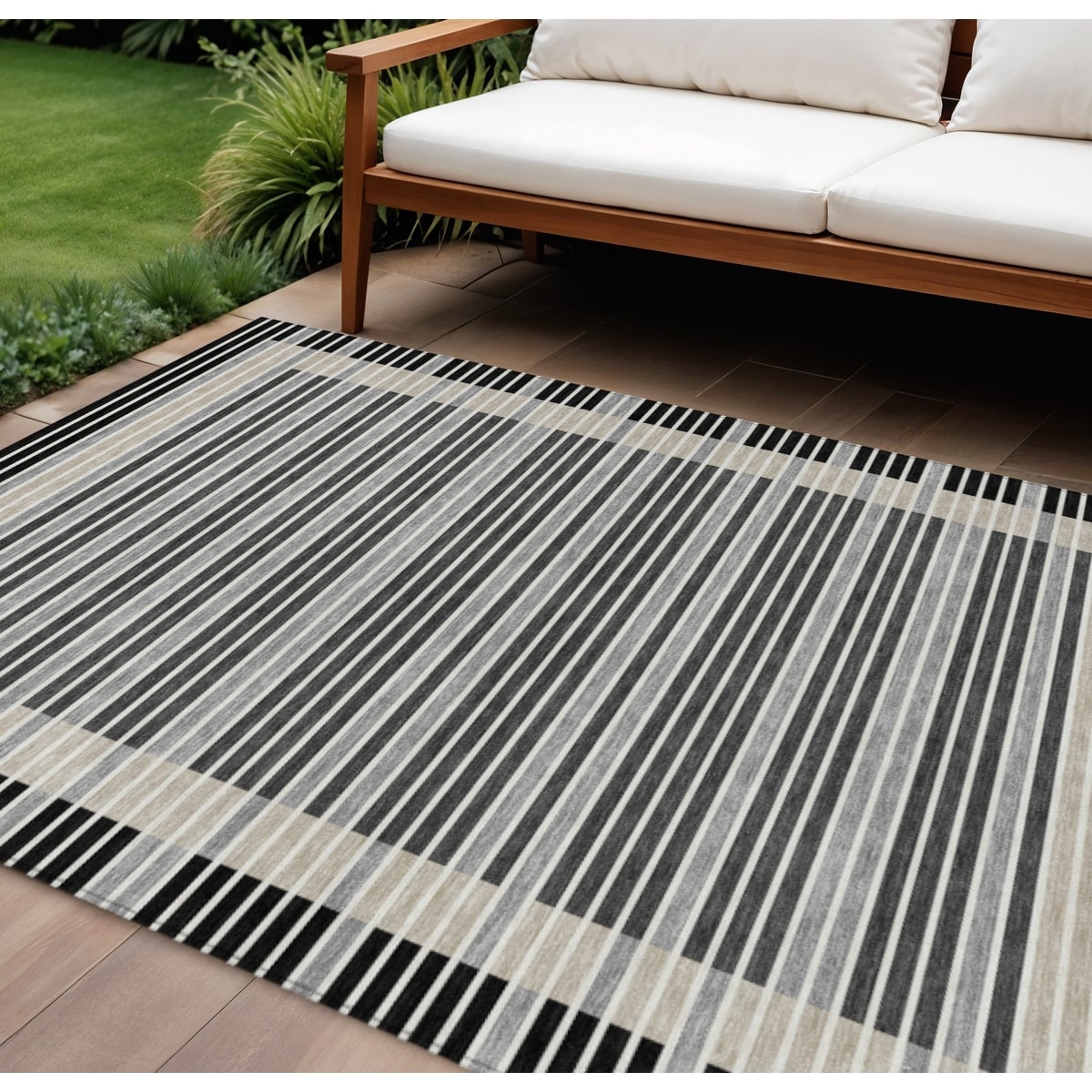 9' X 12' Black And Beige Striped Washable Indoor Outdoor Area Rug - 9' x 12'