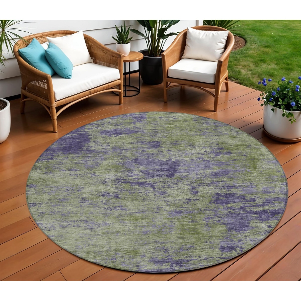 8' Olive Green And Dark Purple Round Abstract Washable Indoor Outdoor Area Rug - 6' x 9'
