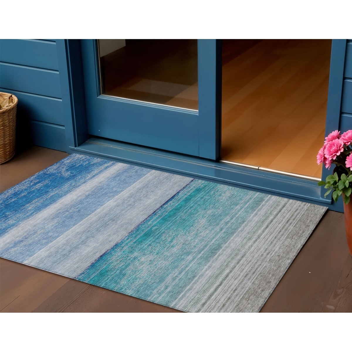 5' X 8' Teal Blue And Aqua Striped Washable Indoor Outdoor Area Rug - 5' x 8'