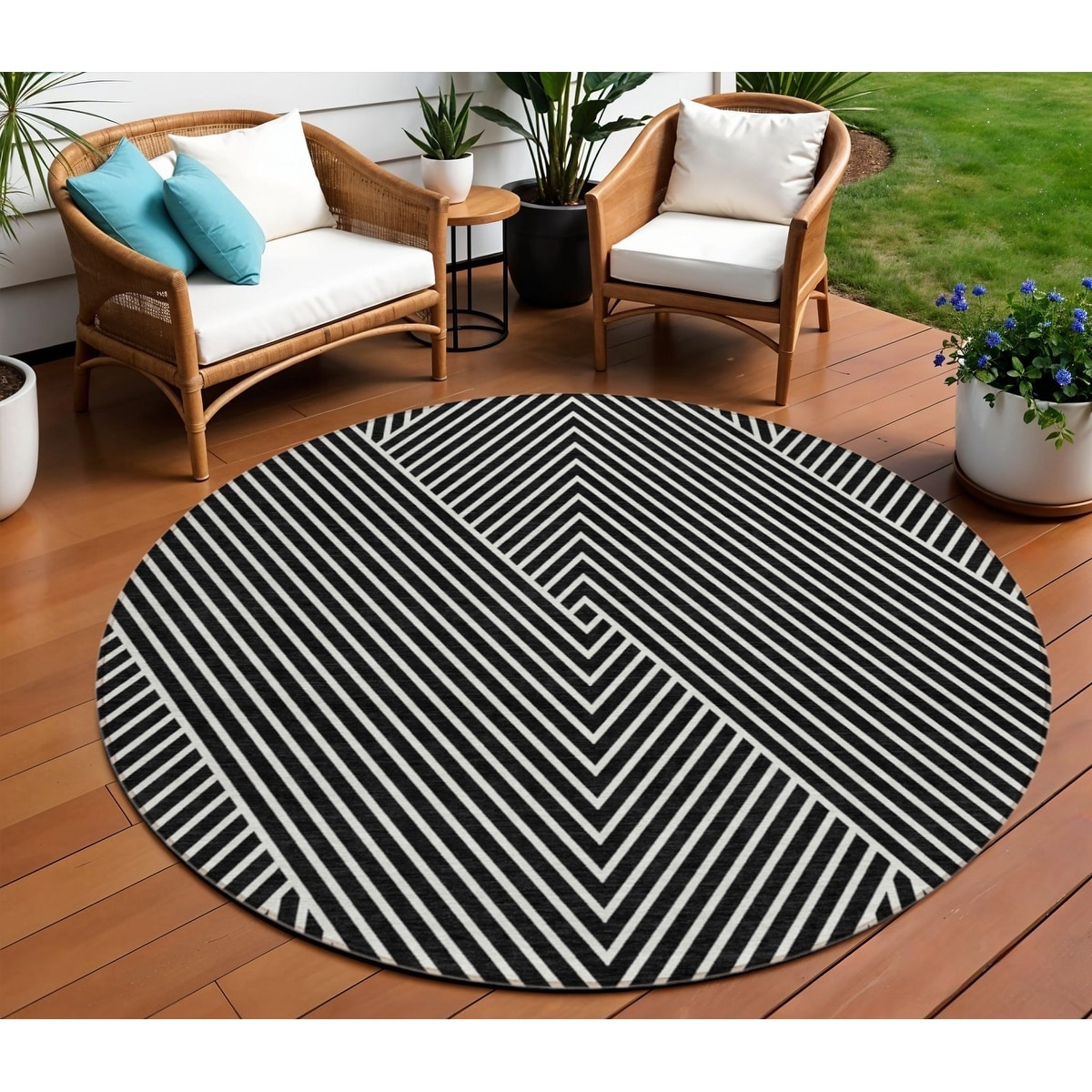 8' Black And Ivory Round Geometric Washable Indoor Outdoor Area Rug - 6' x 9'