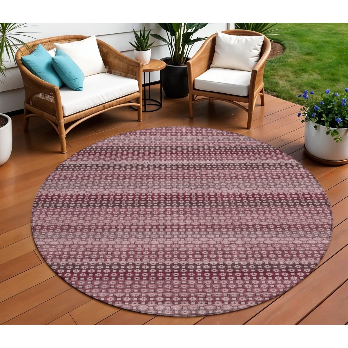 8' Red And Burgundy Round Striped Washable Indoor Outdoor Area Rug - 6' x 9'