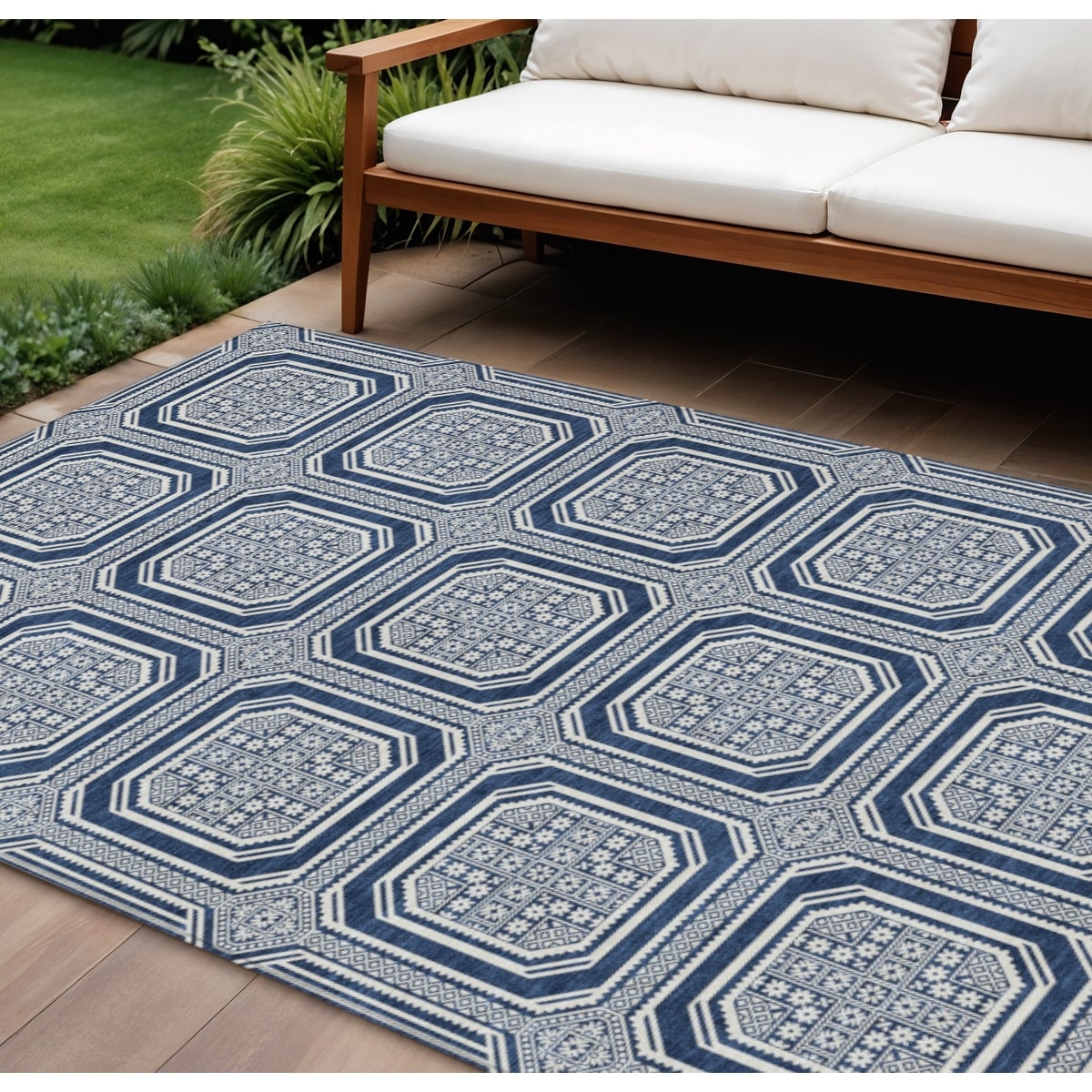 9' X 12' Navy Blue And Ivory Geometric Washable Indoor Outdoor Area Rug - 9' x 12'