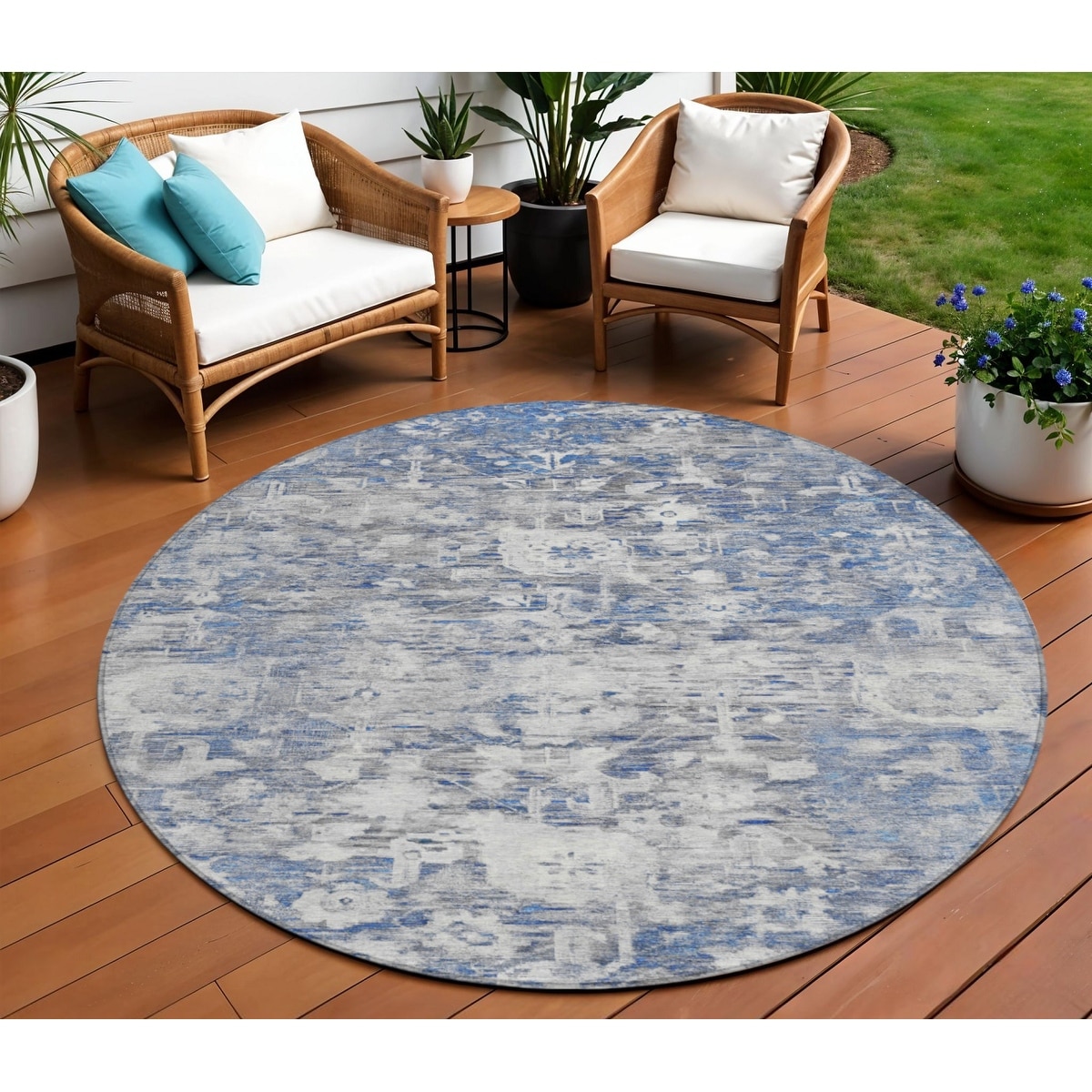 8' Blue And Denim Blue Round Floral Washable Indoor Outdoor Area Rug - 6' x 9'