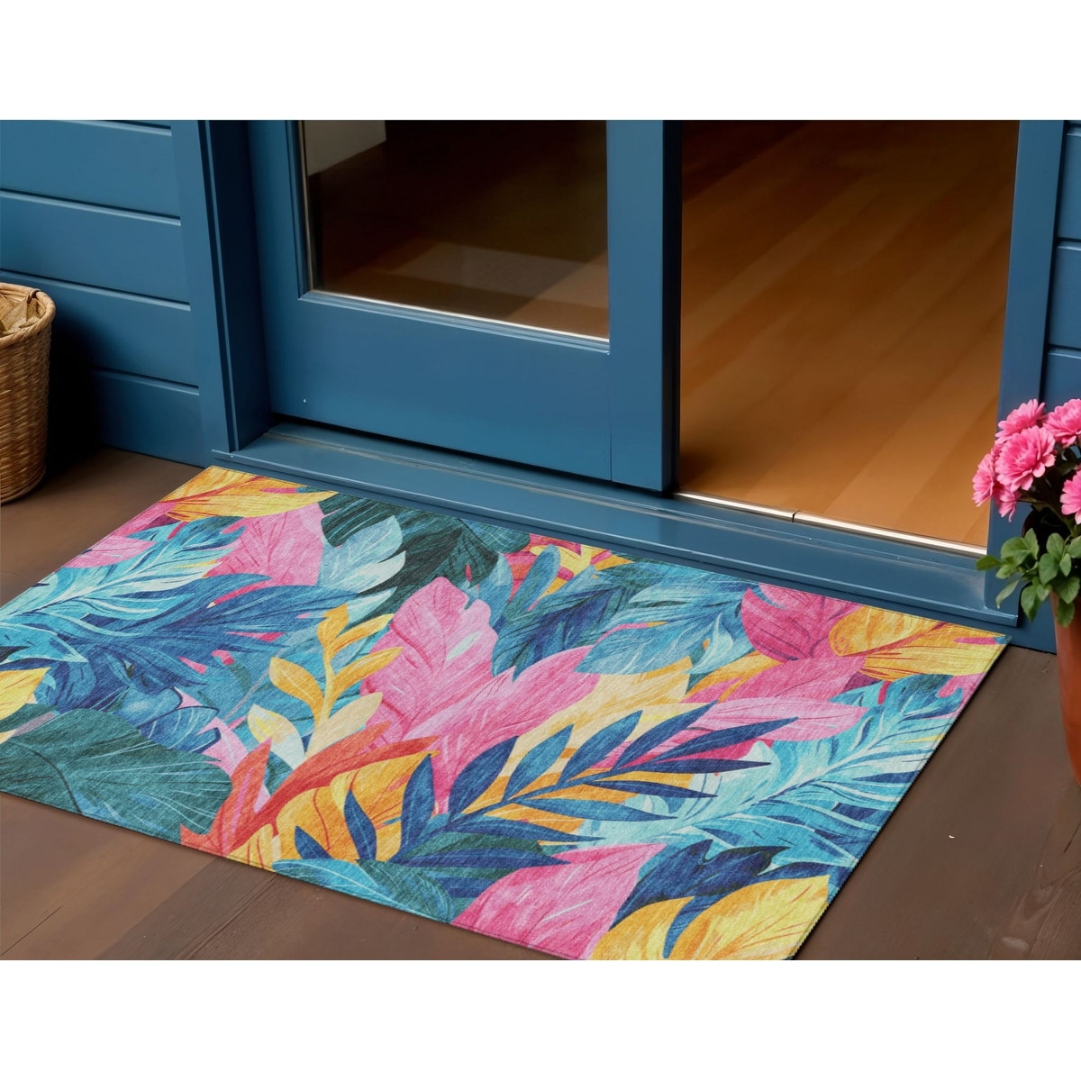 3' X 5' Sky Blue And Pink Floral Washable Indoor Outdoor Area Rug - 3' x 6'