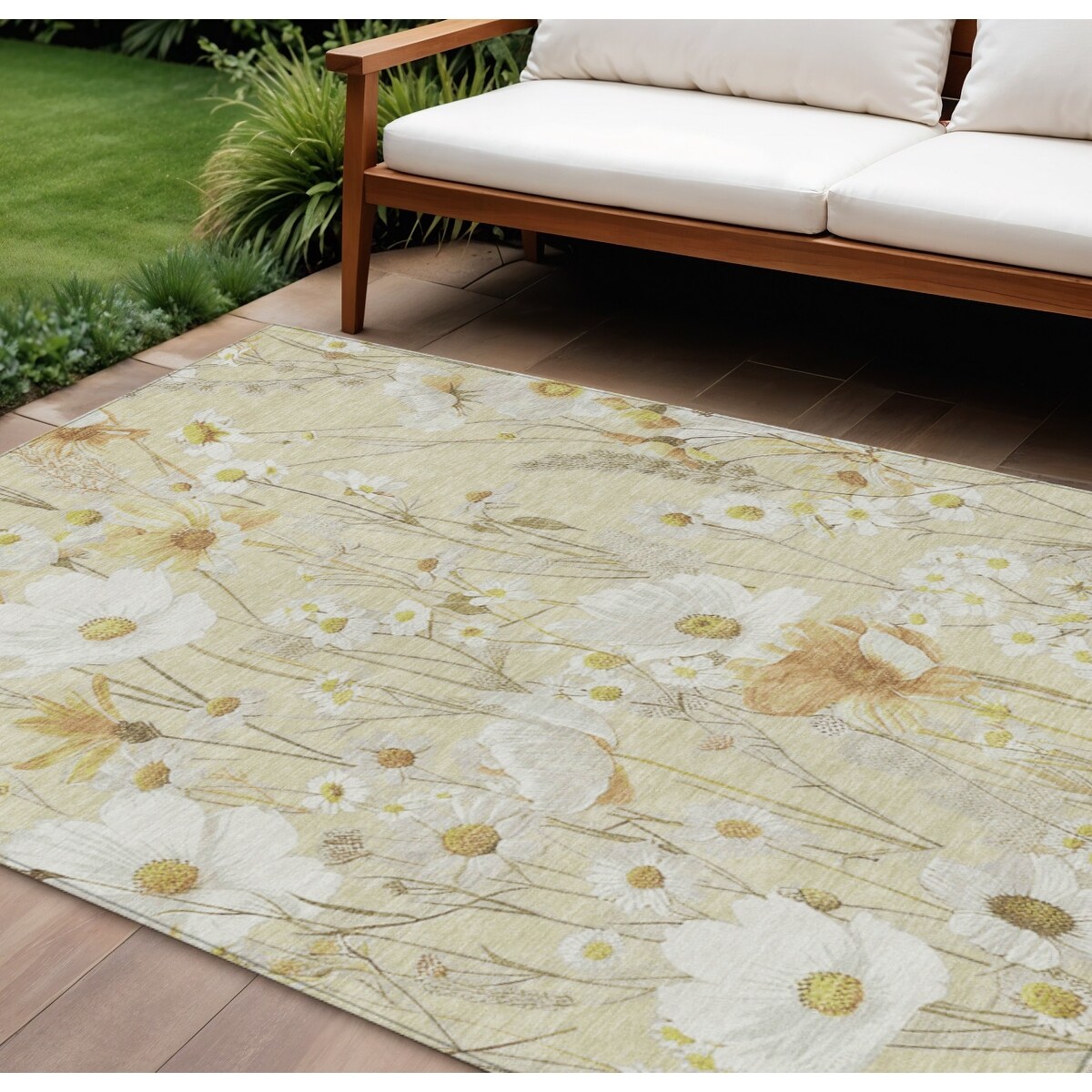 9' X 12' Wheat And Ivory Floral Washable Indoor Outdoor Area Rug - 9' x 12'