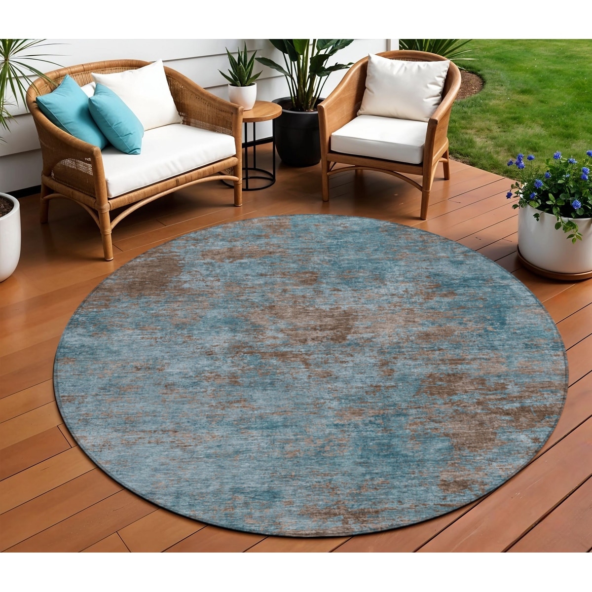 8' Teal Blue And Brown Round Abstract Washable Indoor Outdoor Area Rug - 6' x 9'