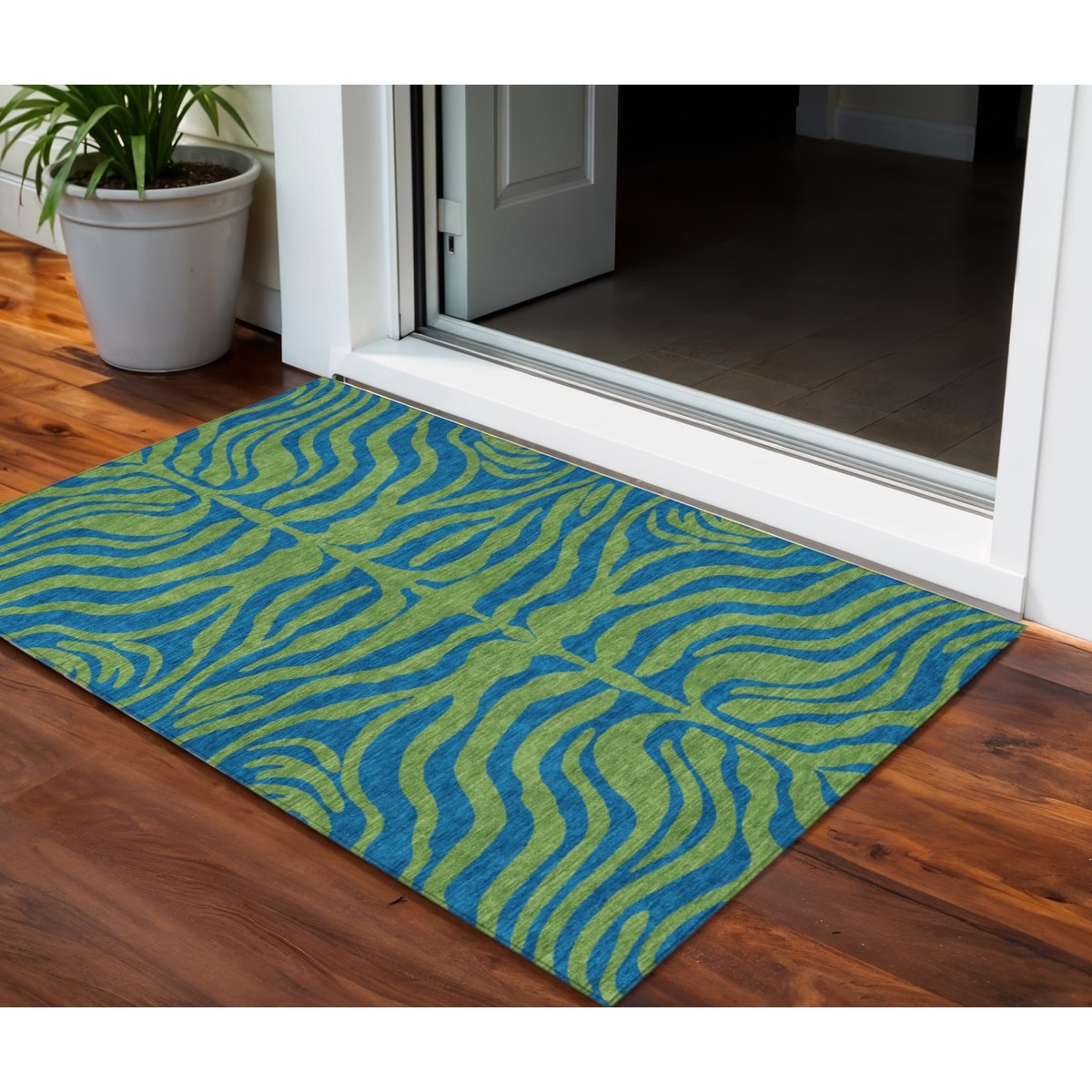 3' X 5' Green And Teal Blue Animal Print Washable Indoor Outdoor Area Rug - 3' x 6'