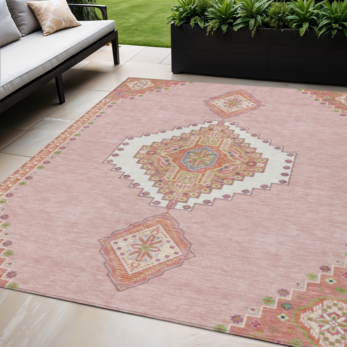 5' X 8' Pink Green And Ivory Oriental Washable Indoor Outdoor Area Rug - 5' x 8'