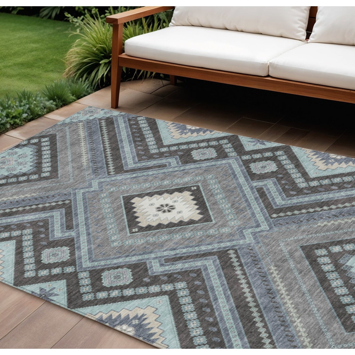 8' X 10' Pewter Charcoal And Sky Blue Tribal Washable Indoor Outdoor Area Rug - 9' x 12'