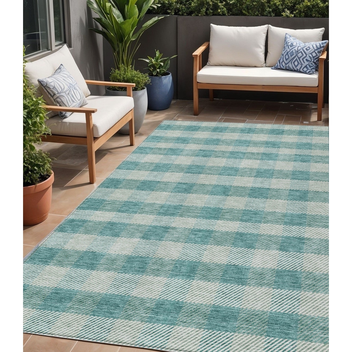 5' X 8' Teal Blue And Ivory Plaid Washable Indoor Outdoor Area Rug - 5' x 8'