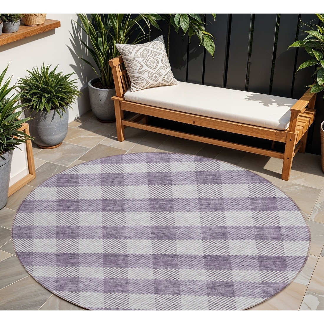 8' Lavender And Ivory Round Plaid Washable Indoor Outdoor Area Rug - 8' x 11'