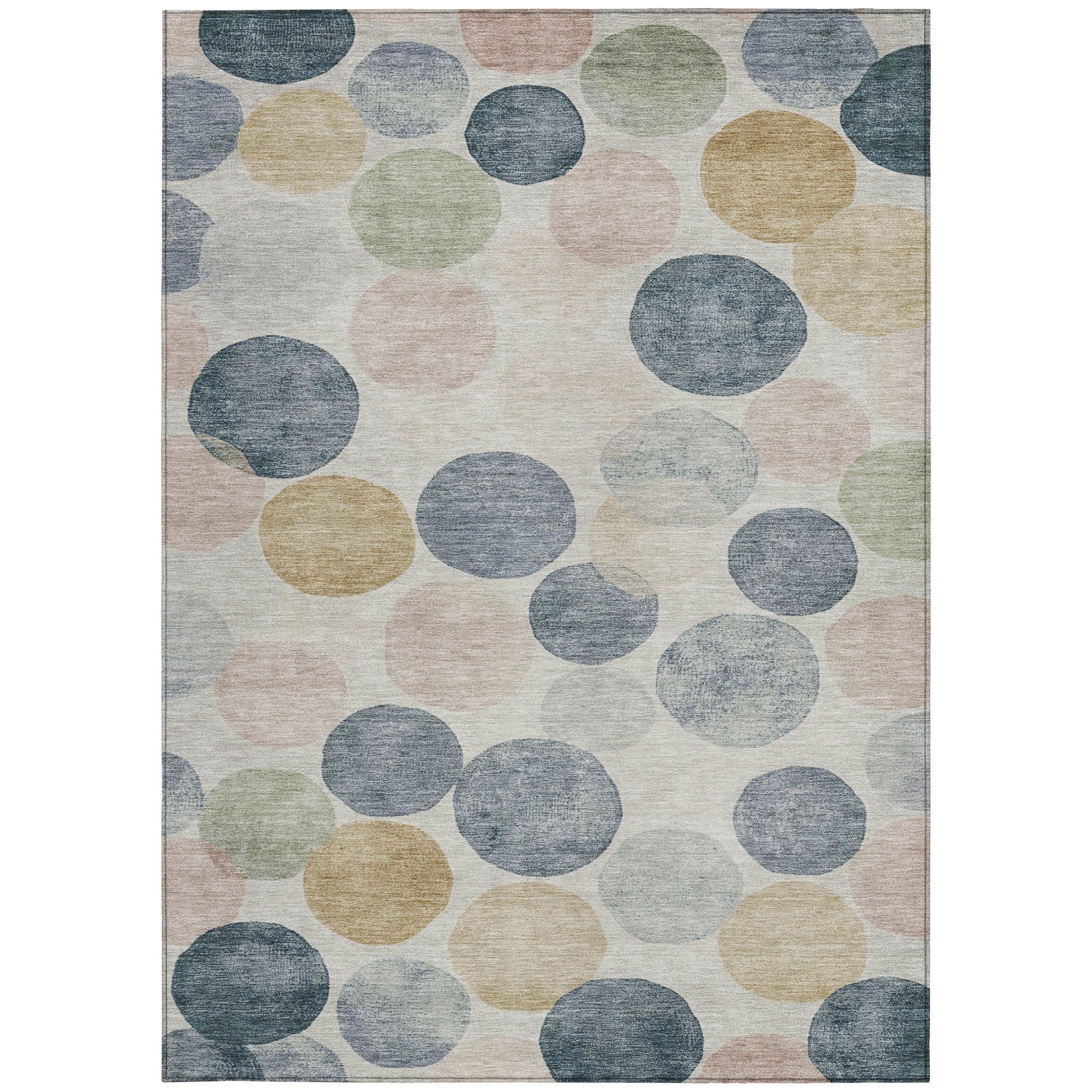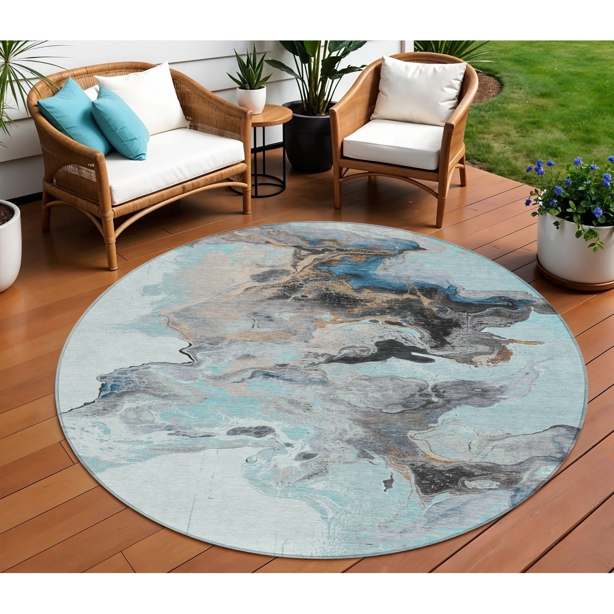 8' Teal Blue Gold And Gray Round Abstract Washable Indoor Outdoor Area Rug - 6' x 9'