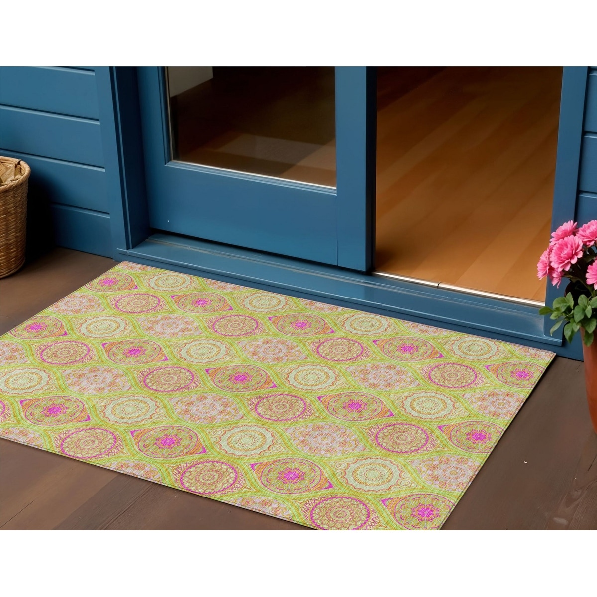 3' X 5' Lime Green Pink And Ivory Floral Medallion Washable Indoor Outdoor Area Rug - 3' x 6'