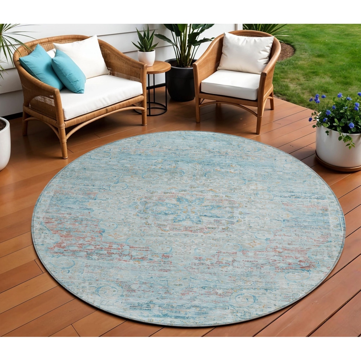 8' Sky Blue And Blush Round Medallion Washable Indoor Outdoor Area Rug - 6' x 9'