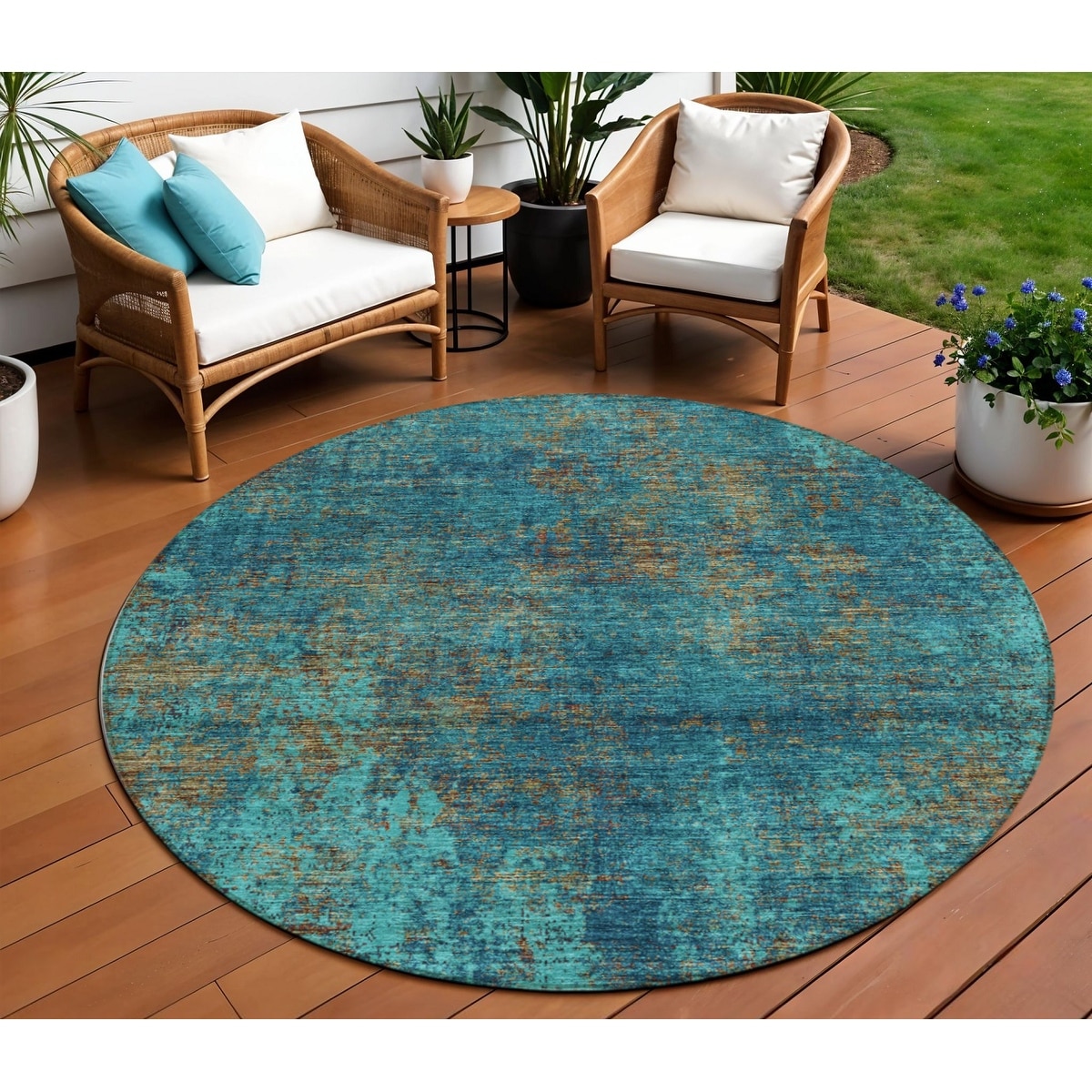 8' Teal Blue Navy Blue And Brown Round Abstract Washable Indoor Outdoor Area Rug - 6' x 9'