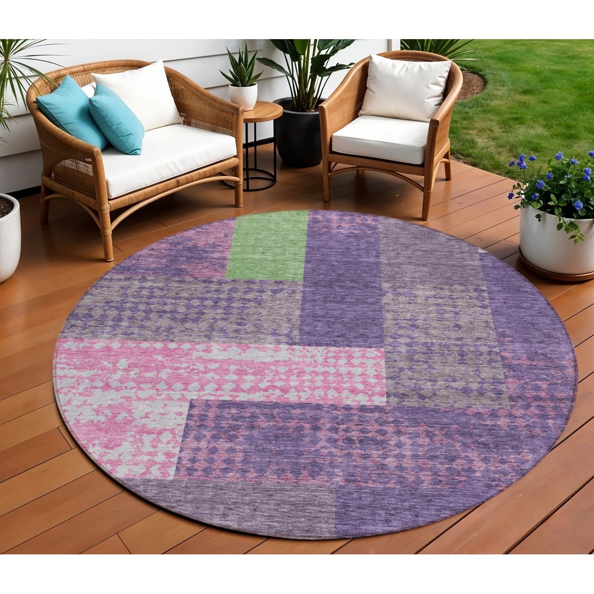 8' Purple Green And Pink Round Geometric Washable Indoor Outdoor Area Rug - 6' x 9'