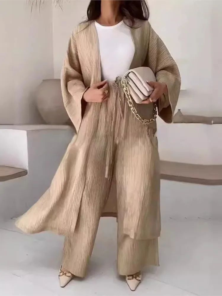 Women's Solid Color Long Cardigan & Wide Leg Pants Set Casual Loose Commuter 2 Piece Outfit gray 14