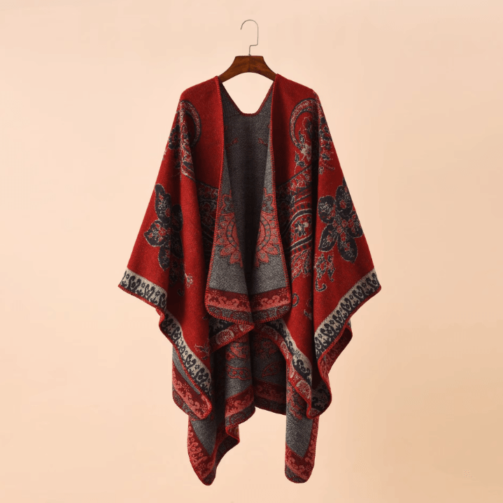 One Size Red Geometric Cashmere Poncho Cape Warm Womens Shawl Cloak Wrap With Lattice Flower Pattern red 3